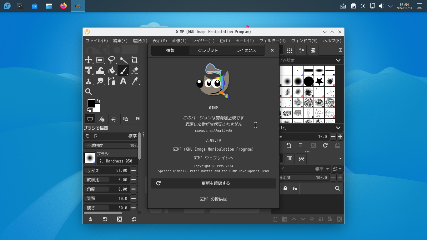 起動時に、今まで見たことのない、ダイアログが表示されました。 起動直後の状態です。 2024年10月31日の時点で、下記のバージョンでした。 操作については、「画像編集ソフト GIMP2」に掲載しています。 上記は簡単なものですので、詳細なものがほしい方は、各所に初歩の手引きから応用編までありますので、そちらを参考にしてください。 |