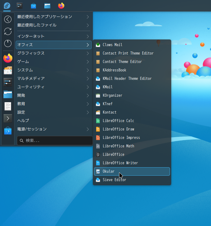 1. 概要 ドキュメントビューアとして、「Okular」を使用します。 「Okular」は、デフォルトでインストールされています。 2. 起動 「スタート」→「オフィス」→「Okular」