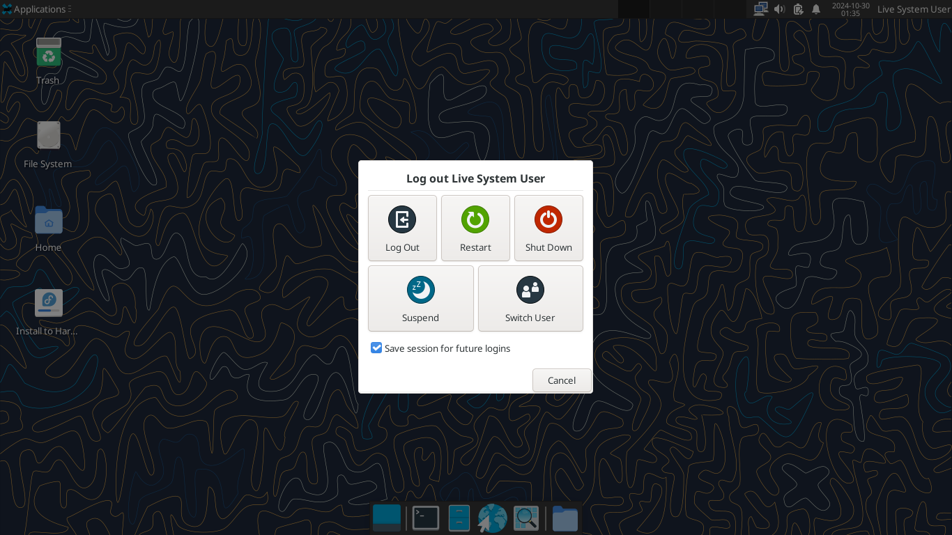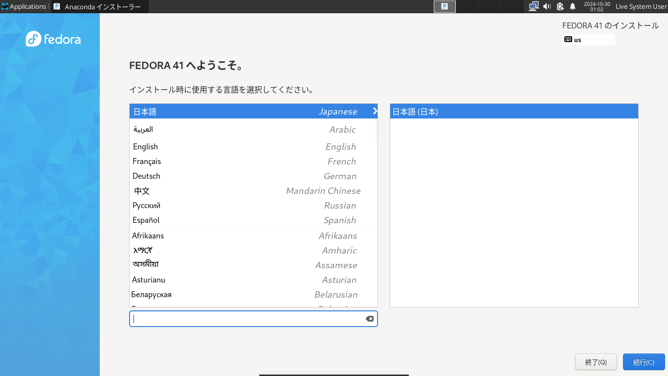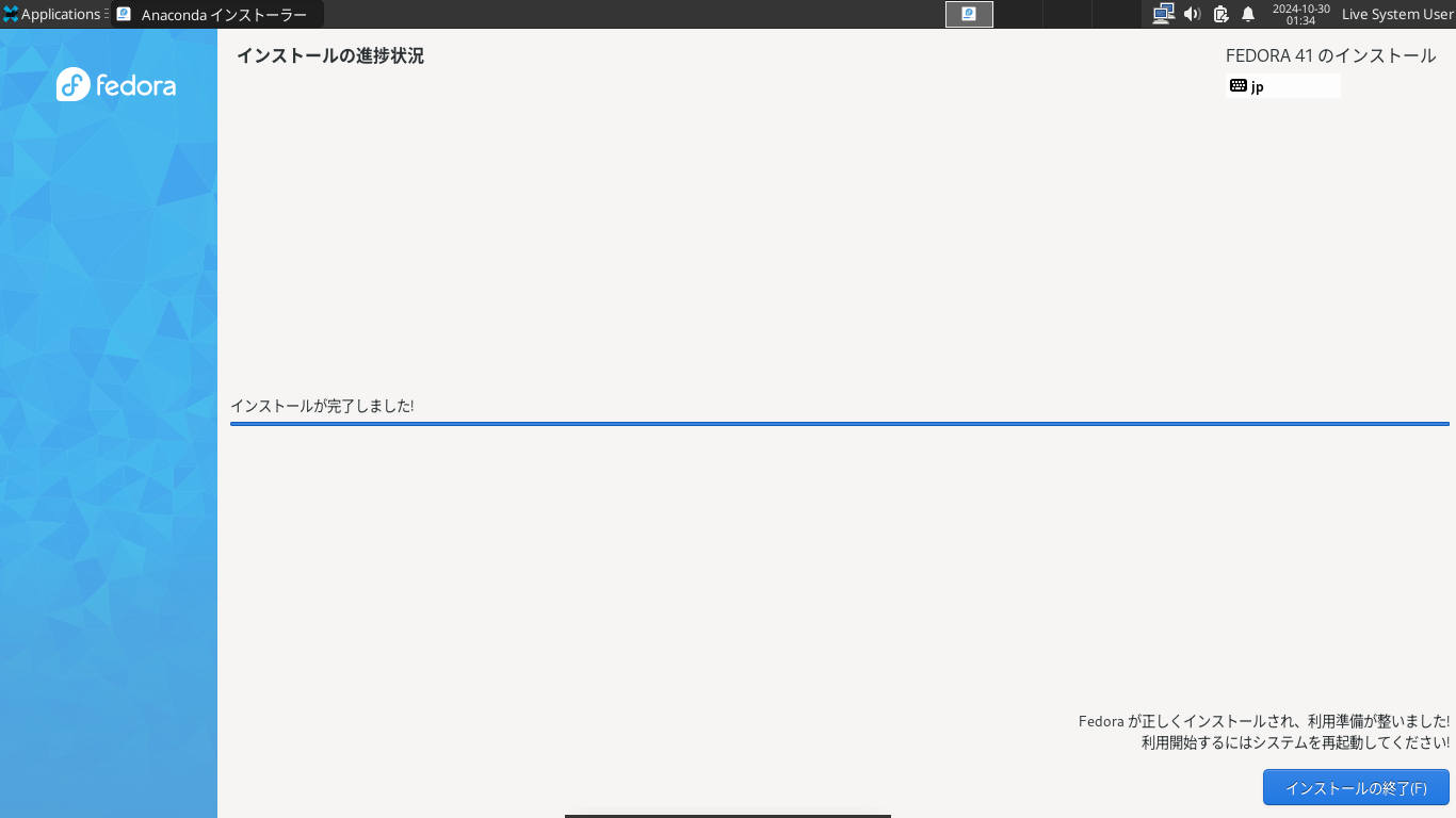 以降の手順は「Fedora - 41 - 共通事項」と同様となりますので、そちらをご参照ください。 インストールが、完了したら 「インストールの終了」 デスクトップに戻って。 「スタート」→「Logout」 「Restart」