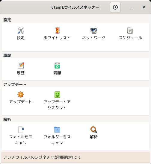 起動直後の状態です。 2024年10月30日の時点で、下記のバージョンでした。 「アンチウィルスのシグネチャが期限切れです」の表示を消す方法や、操作については「デスクトップ環境構築 - 共通事項 - アンチウイルスソフト ClamTk」をご参照ください。 |