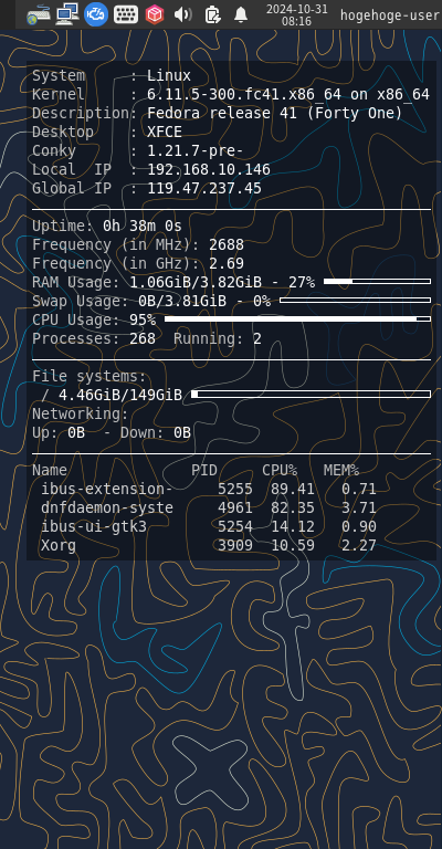再ログイン後に、デスクトップ右に、「Conky」の表示が現れます。