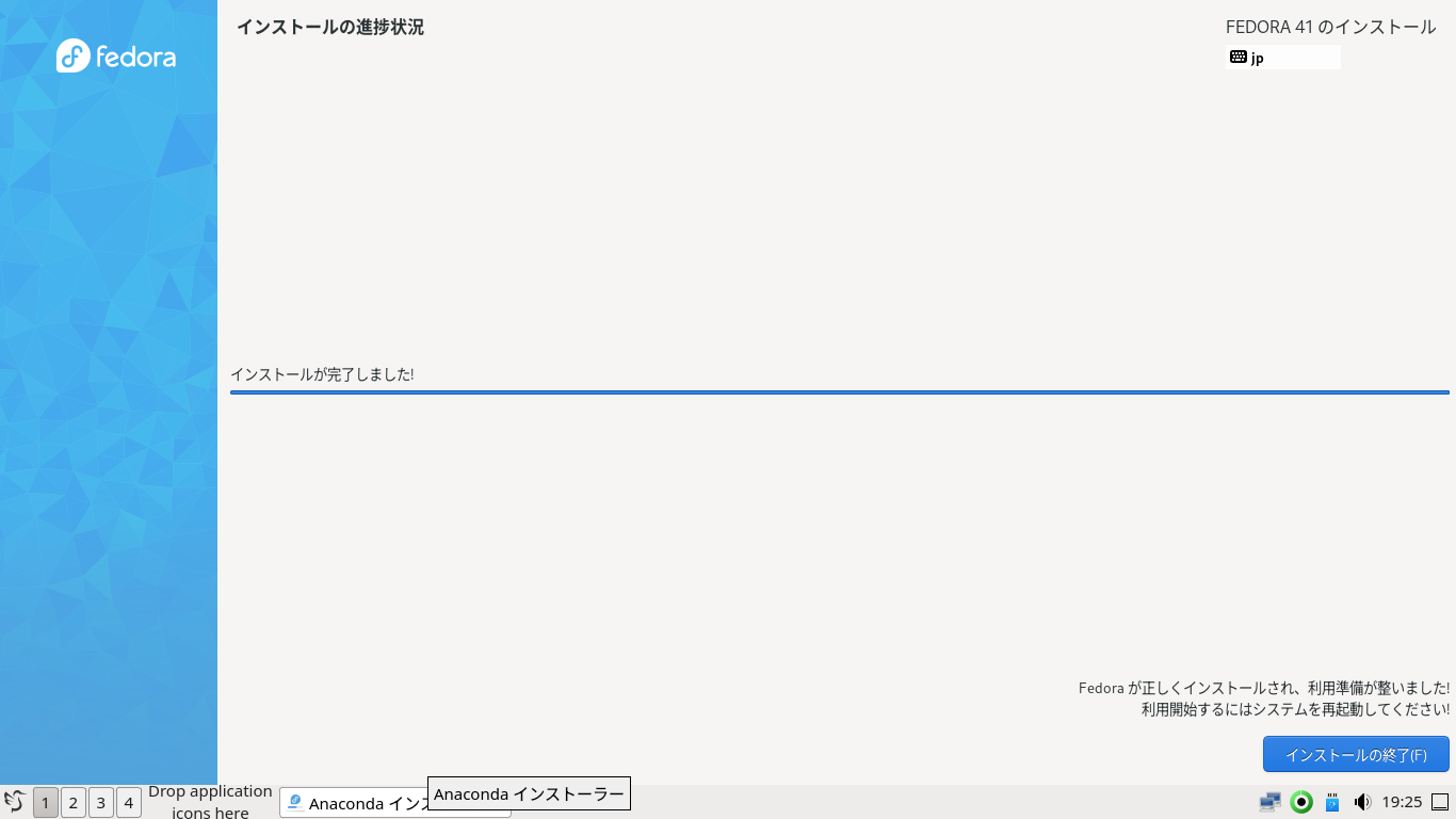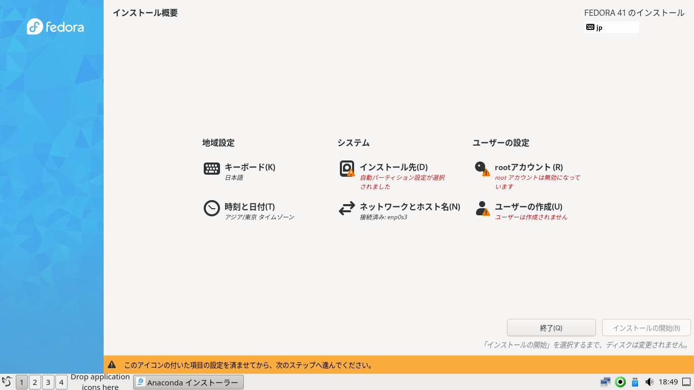 画面や操作が「MATE」と若干異なる部分がありますので、記載しますが、その他は「Fedora - 41 - 共通事項」のインストールの手順をご参照ください。