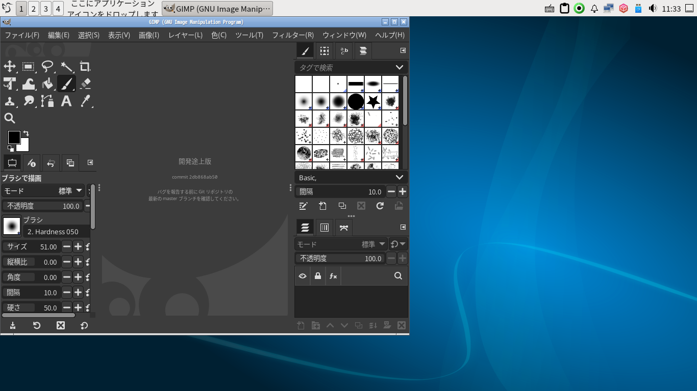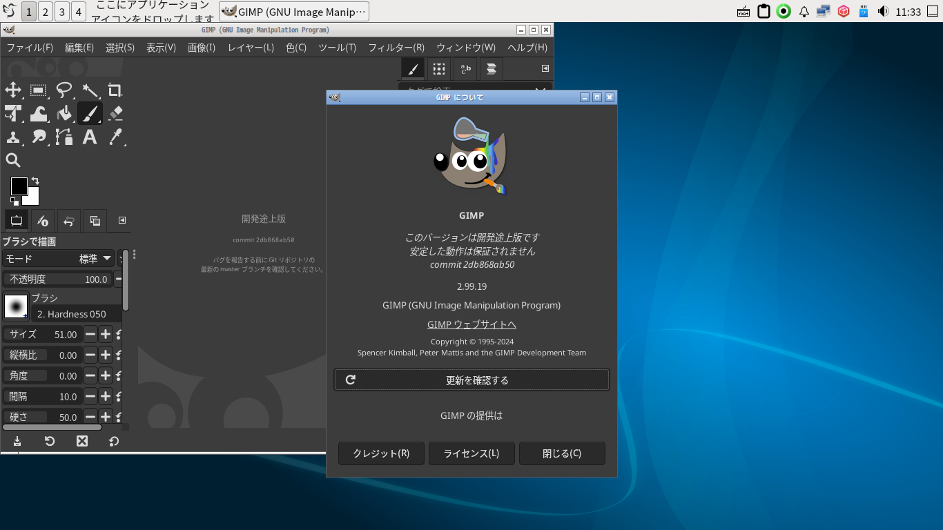 起動時に、今まで見たことのない、ダイアログが表示されます。 「閉じる」 起動直後の状態です。 2024年11月5日の時点で、下記のバージョンでした。 操作については、「画像編集ソフト GIMP2」に掲載しています。 上記は簡単なものですので、詳細なものがほしい方は、各所に初歩の手引きから応用編までありますので、そちらを参考にしてください。 |
