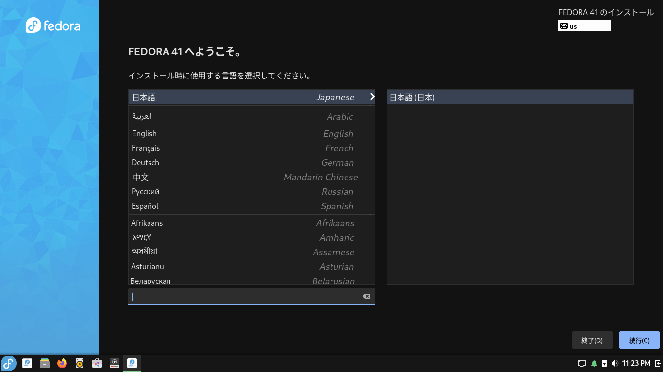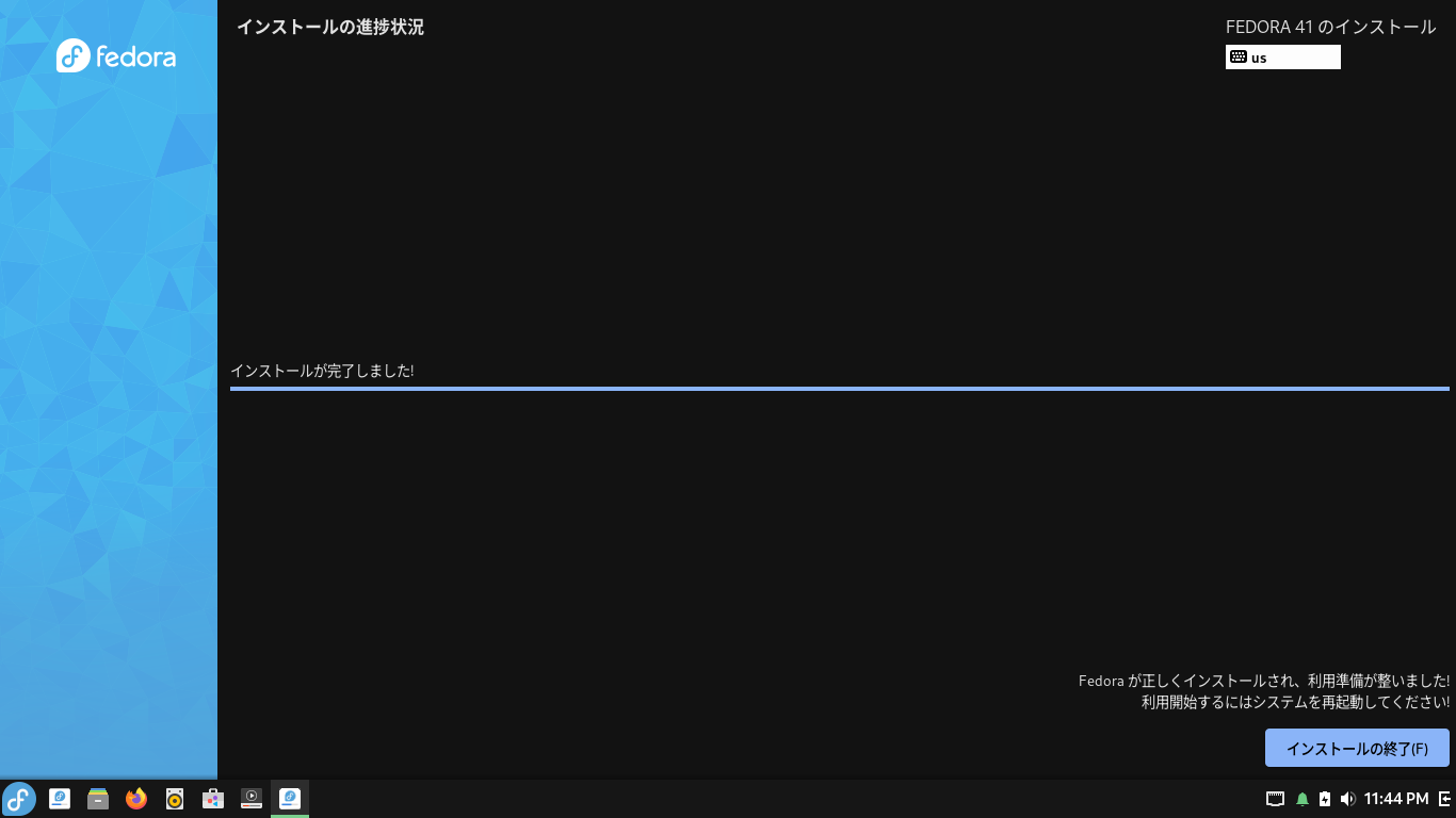 3. インストール 以降の手順は「Fedora - 41 - MATE」と同様となりますので、そちらをご参照ください。 インストールが、完了したら。 「インストールの終了」