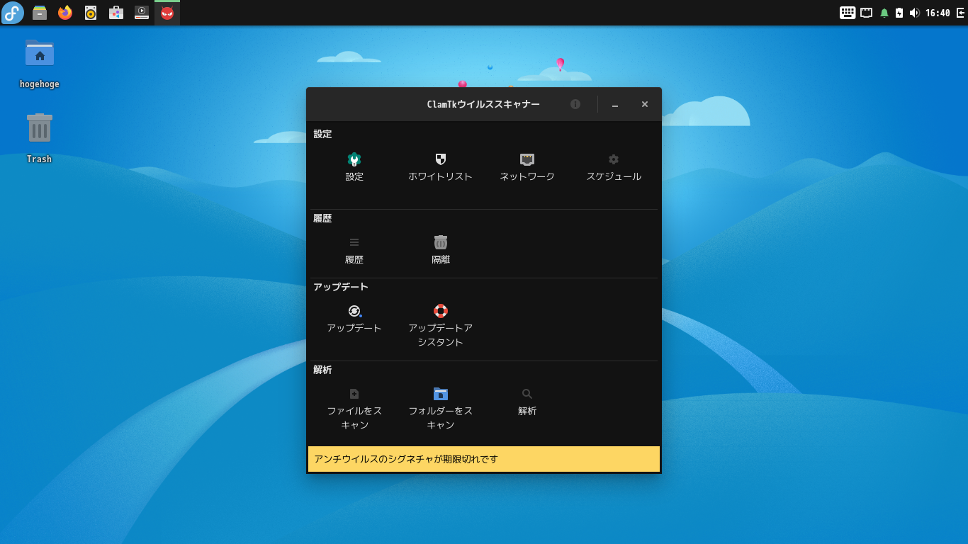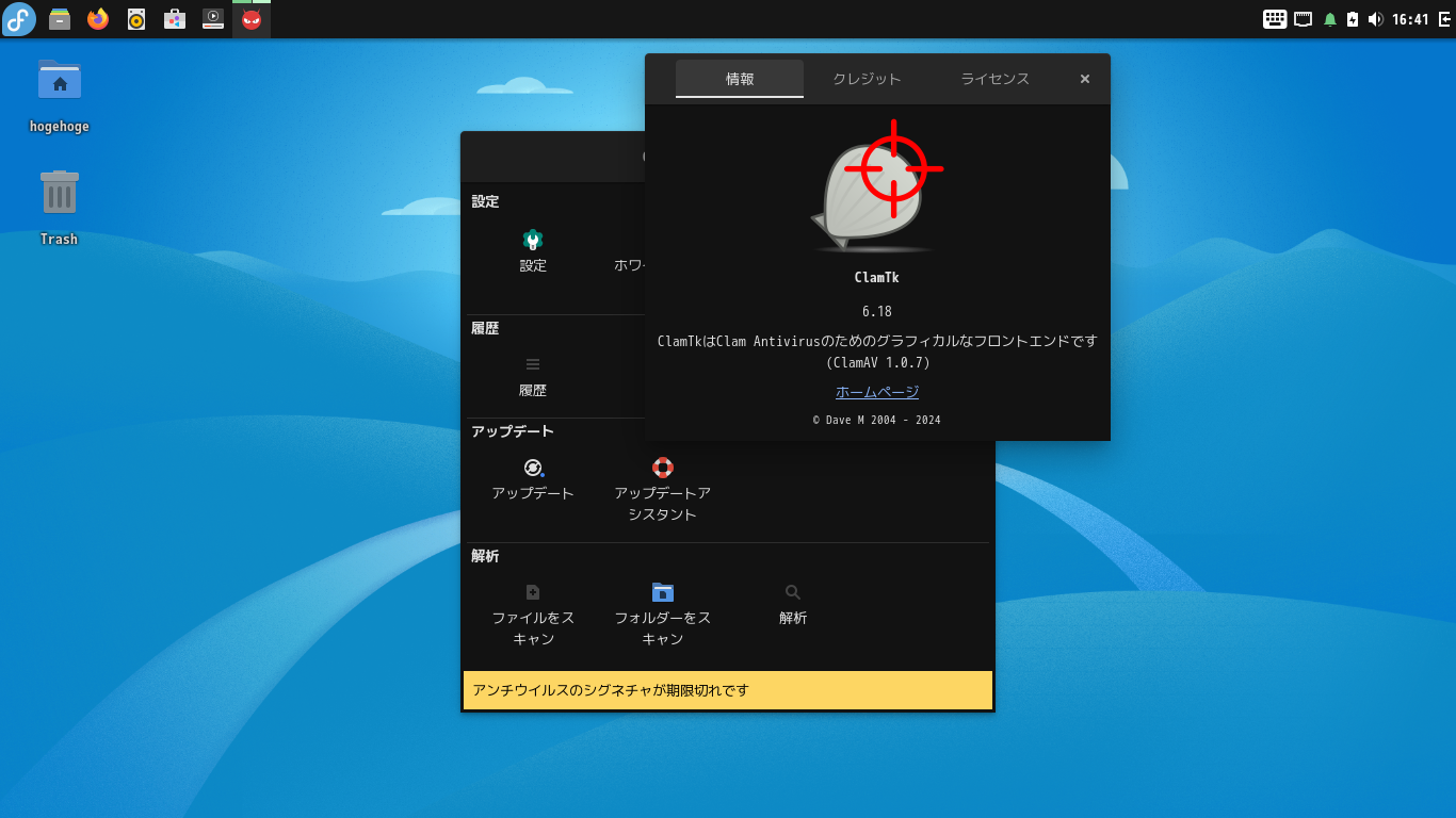 起動直後の状態です。 2024年11月5日の時点で、下記のバージョンでした。 「アンチウィルスのシグネチャが期限切れです」の表示を消す方法や、操作については「デスクトップ環境構築 - 共通事項 - アンチウイルスソフト ClamTk」をご参照ください。 |