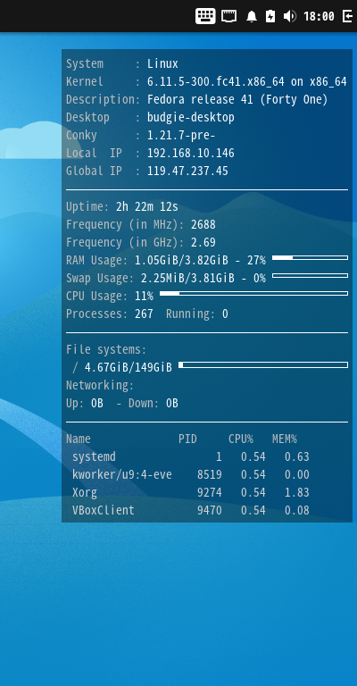 ログイン後に、デスクトップ右に、「Conky」の表示が現れます。