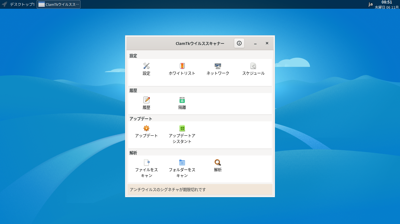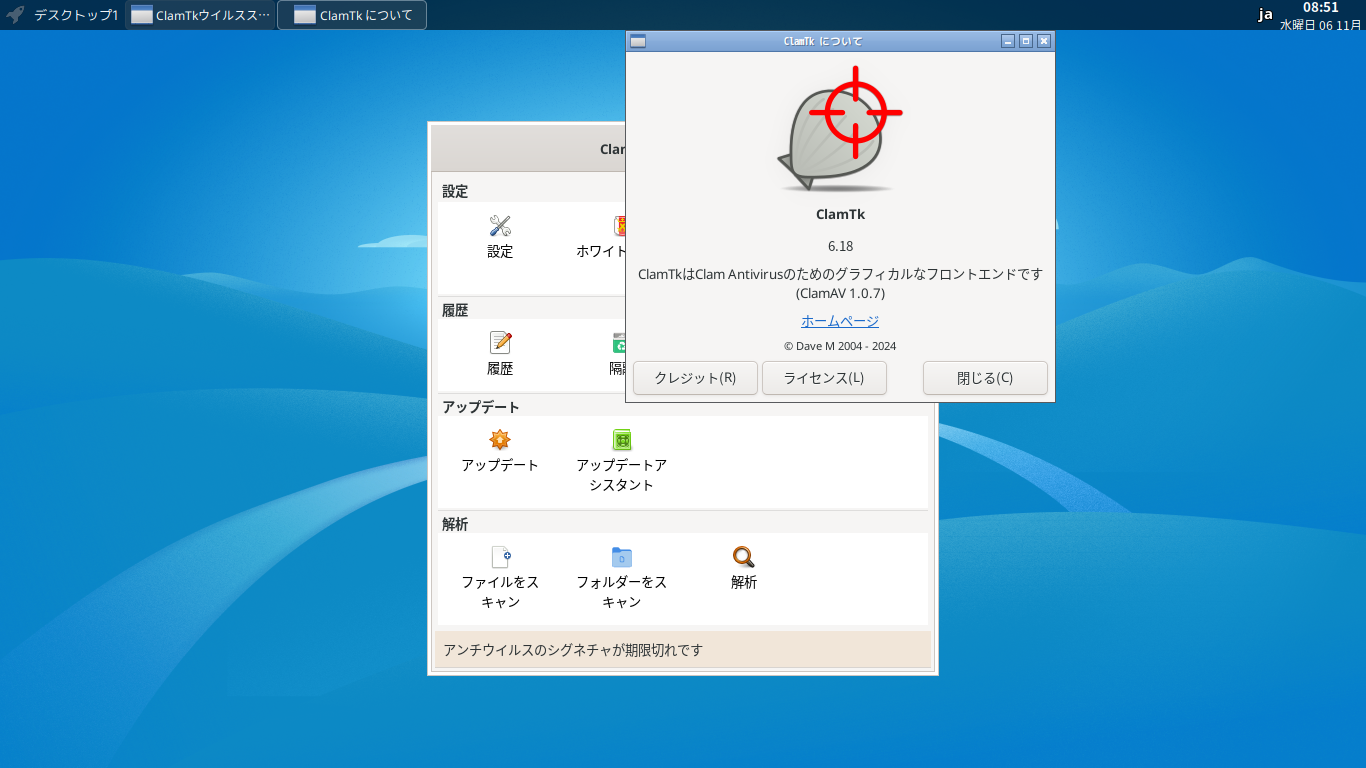 起動直後の状態です。 2024年11月6日の時点で、下記のバージョンでした。 「アンチウィルスのシグネチャが期限切れです」の表示を消す方法や、操作については「デスクトップ環境構築 - 共通事項 - アンチウイルスソフト ClamTk」をご参照ください。 |