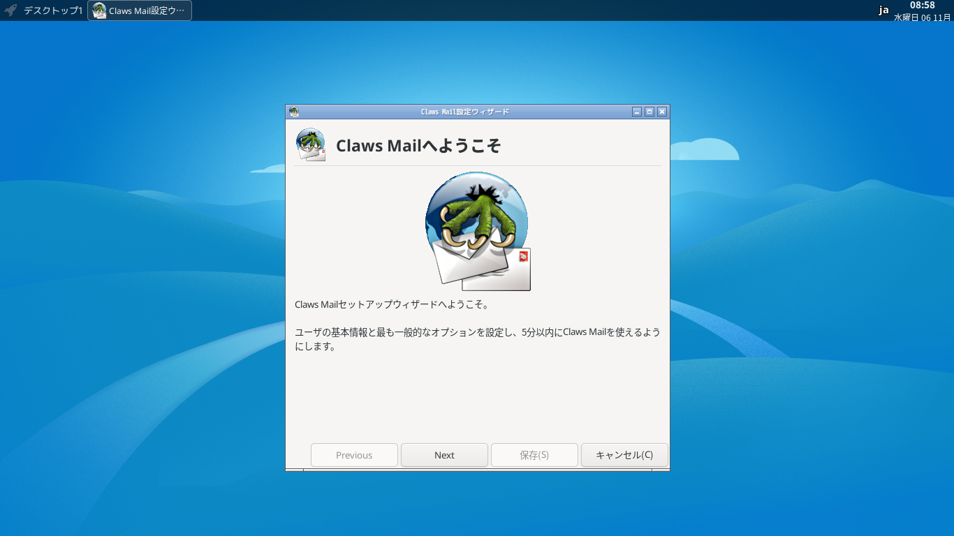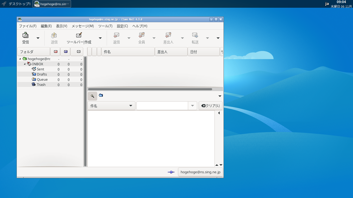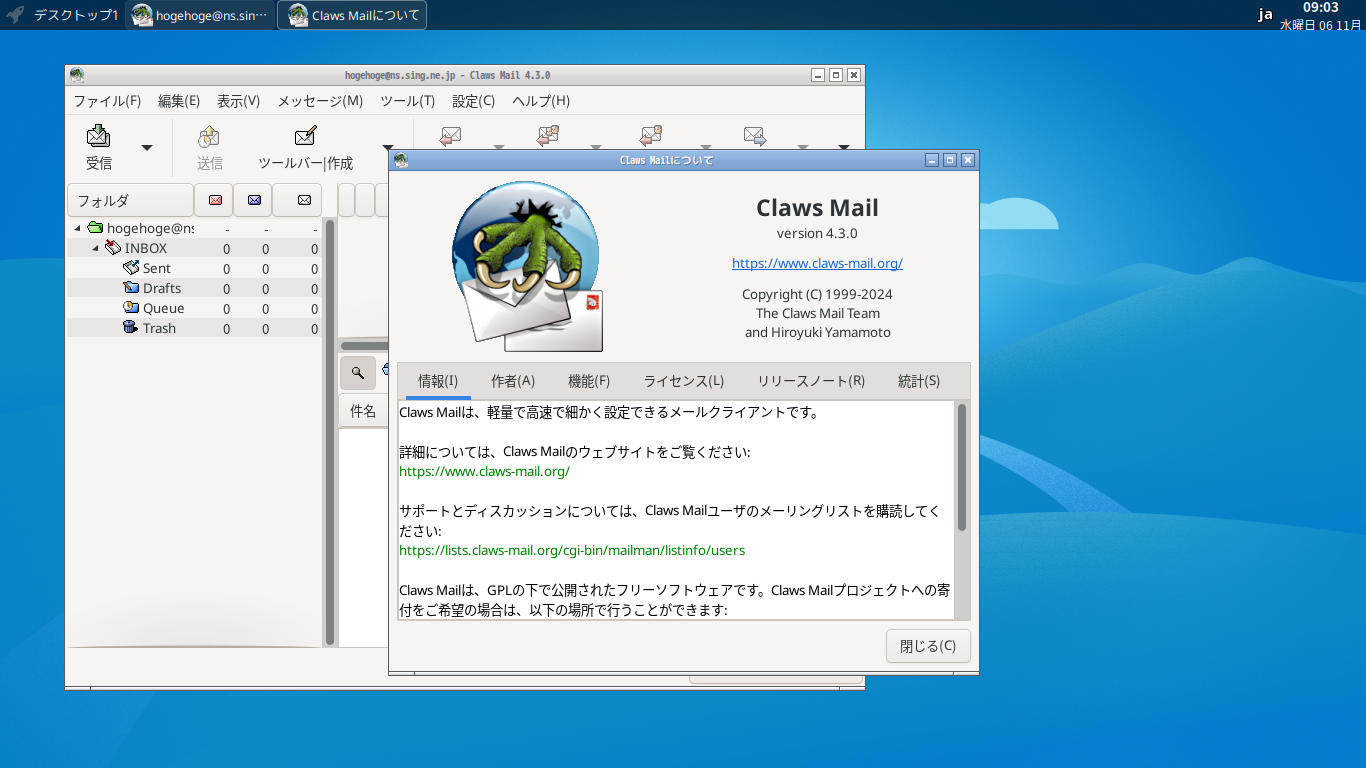 初回起動時は「設定ウィザード」から始まります。 起動直後の状態です。 2024年5月20日の時点で、下記のバージョンでした。 「設定ウィザード」他、操作方法については、「メールクライアント - Claws Mail」をご参照ください。 |