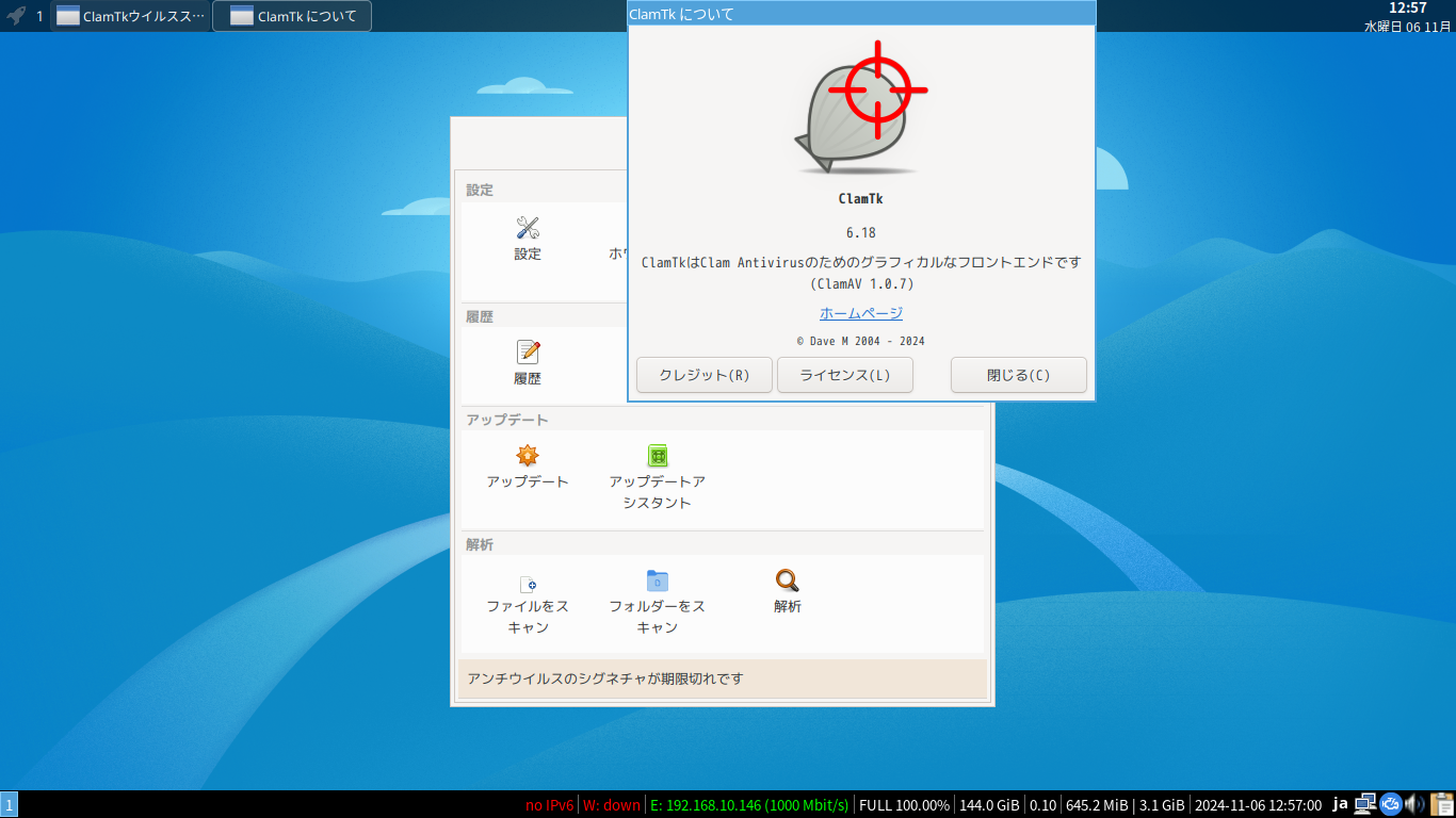 起動直後の状態です。 2024年11月6日の時点で、下記のバージョンでした。 「アンチウィルスのシグネチャが期限切れです」の表示を消す方法や、操作については「デスクトップ環境構築 - 共通事項 - アンチウイルスソフト ClamTk」をご参照ください。 |