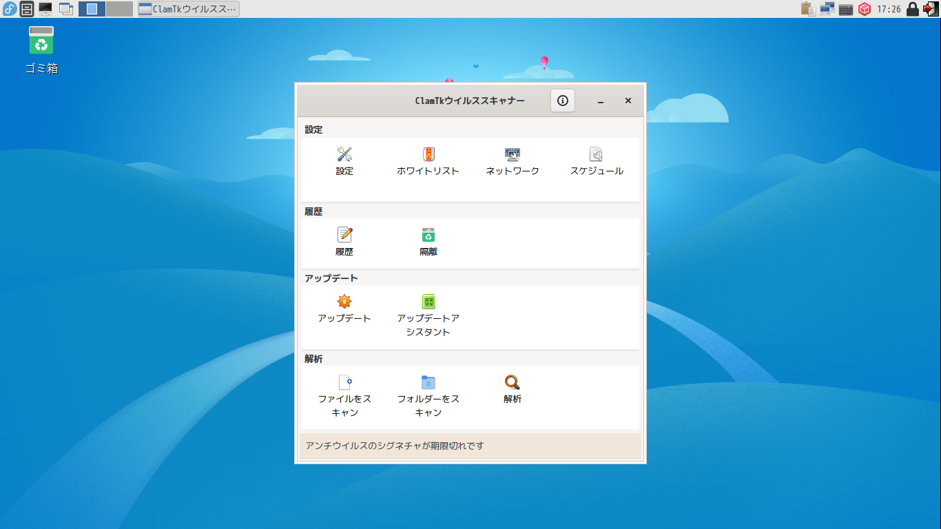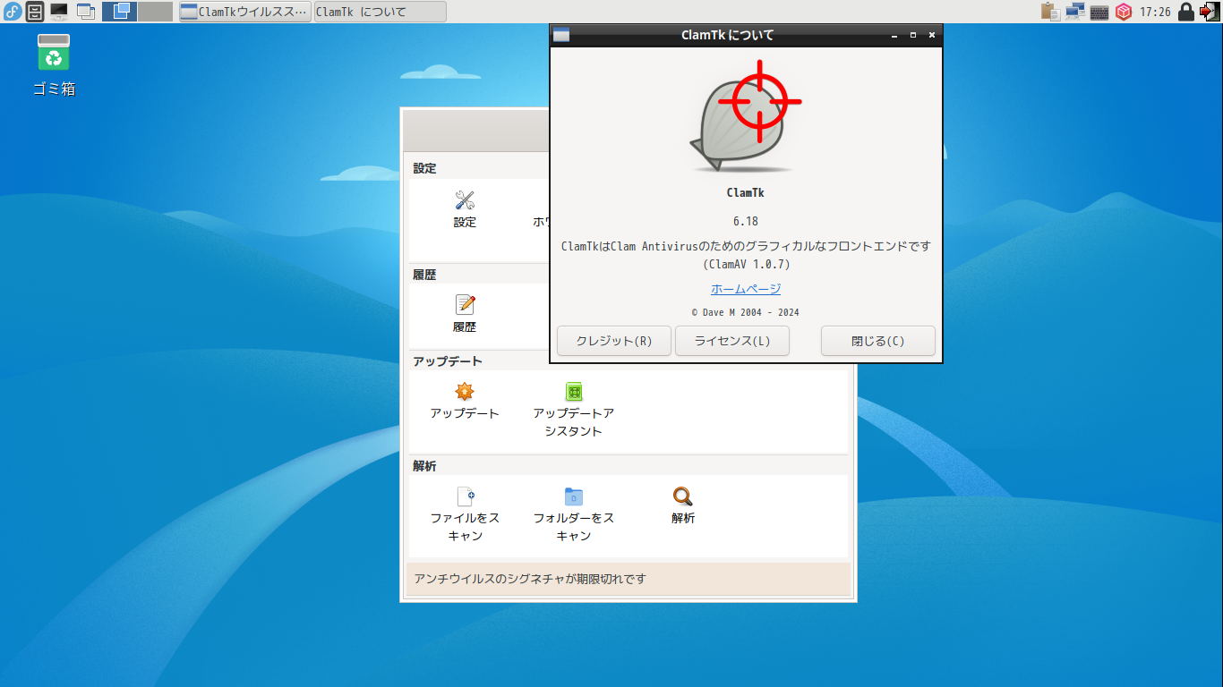 起動直後の状態です。 2024年11月6日の時点で、下記のバージョンでした。 「アンチウィルスのシグネチャが期限切れです」の表示を消す方法や、操作については「デスクトップ環境構築 - 共通事項 - アンチウイルスソフト ClamTk」をご参照ください。 |