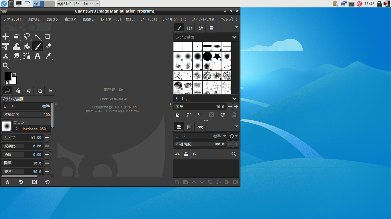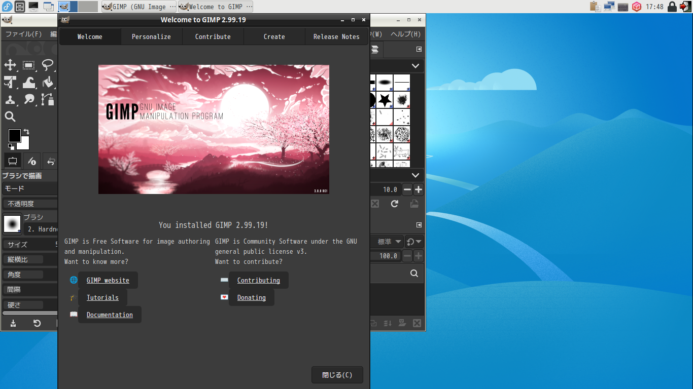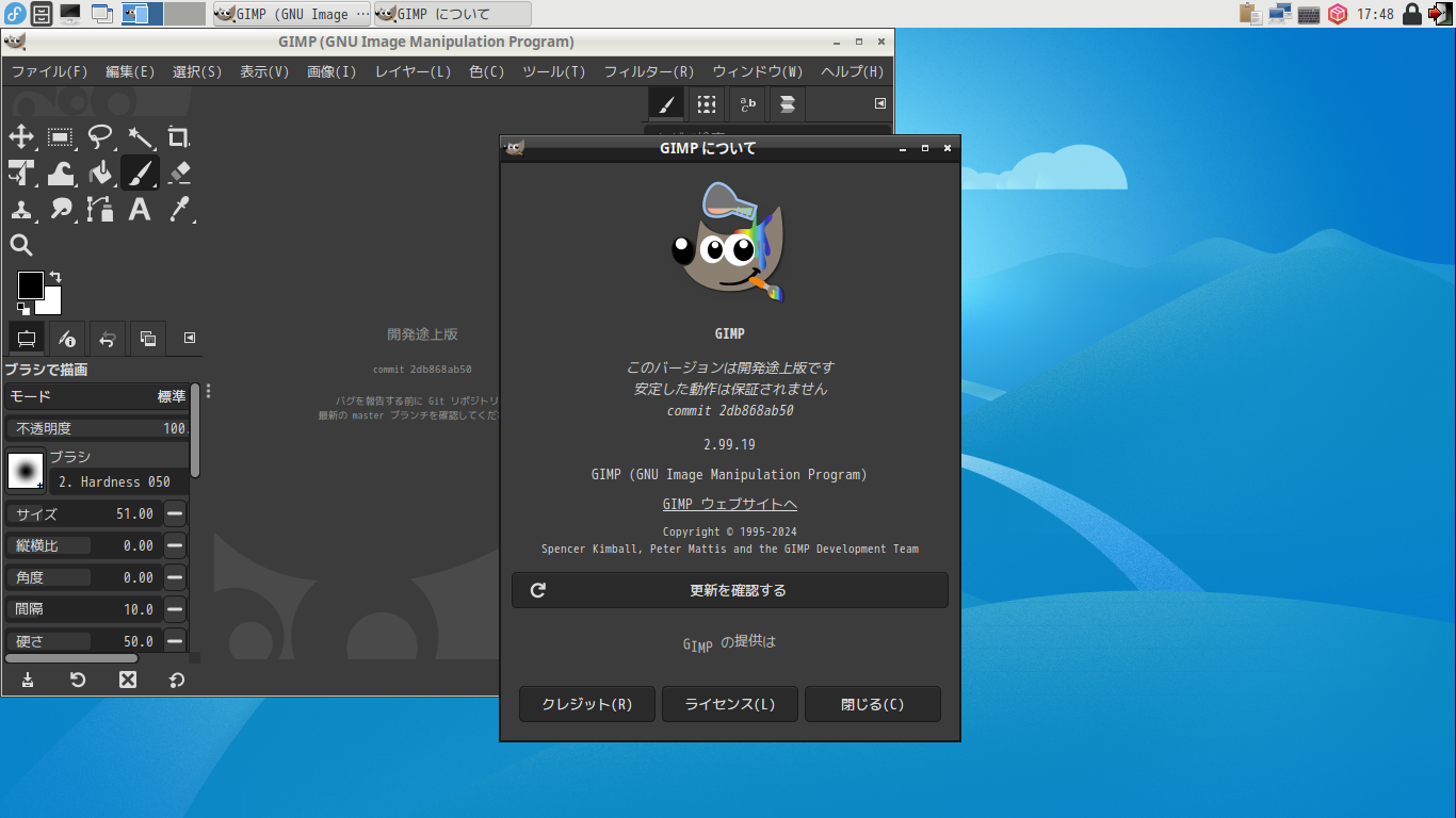 起動時に、今まで見たことのない、ダイアログが表示されます。 「閉じる」 起動直後の状態です。 2024年11月6日の時点で、下記のバージョンでした。 操作については、「画像編集ソフト GIMP2」に掲載しています。 上記は簡単なものですので、詳細なものがほしい方は、各所に初歩の手引きから応用編までありますので、そちらを参考にしてください。 |