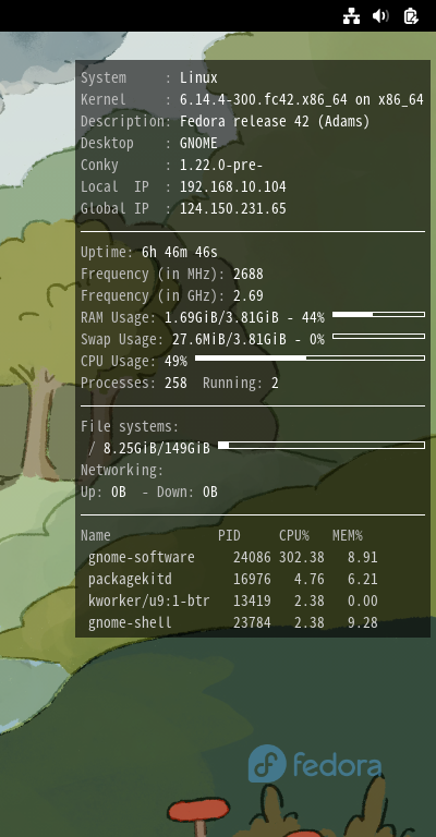 再ログイン後に、デスクトップ右に、「Conky」の表示が現れます。
