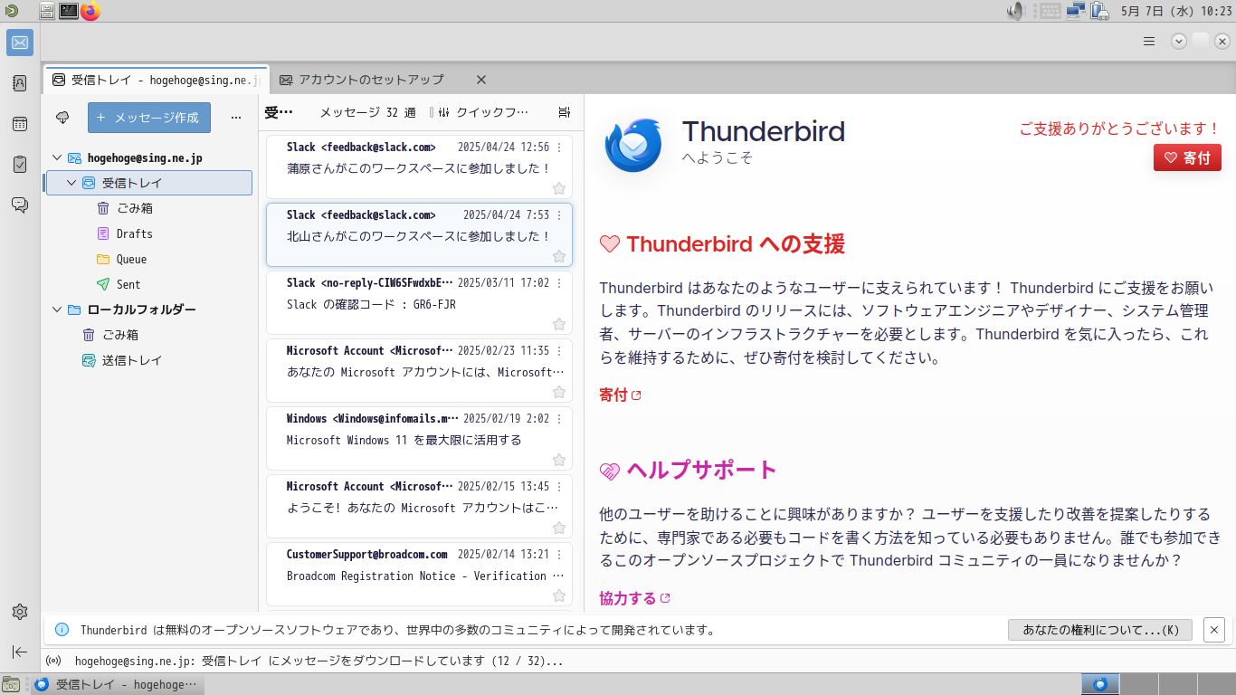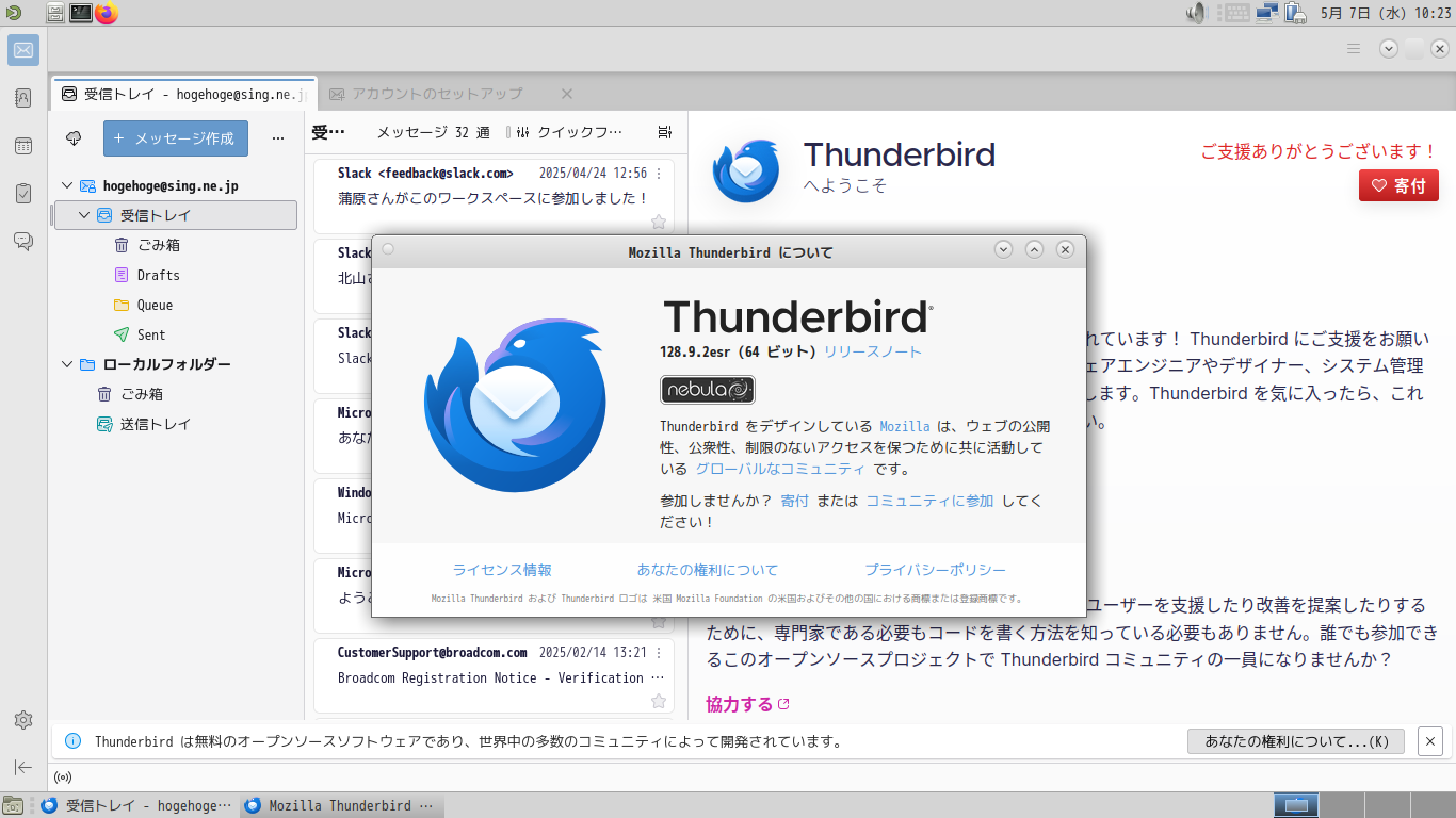 初回起動時は「アカウントセットアップ」から始まります。 起動直後に、受信トレイを開いた状態です。 2025年5月7日の時点で、下記のバージョンでした。 アカウントセットアップの他、操作方法については、「メールクライアント - Thunerbird」をご参照ください。 |