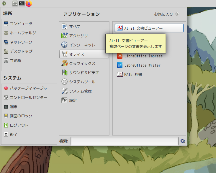 1. 概要 ドキュメントビューアとして、「Atril」を使用します。 「Atril」は、「MATE」のドキュメントビューアなので、デフォルトでインストールされています。 2. 起動 「スタート」→「オフィス」→「Atril」