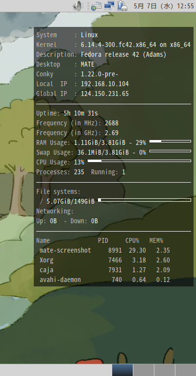 ログイン後に、デスクトップ右に、「Conky」の表示が現れます。