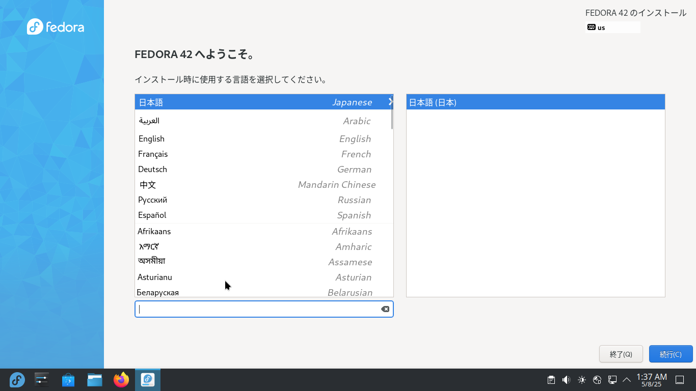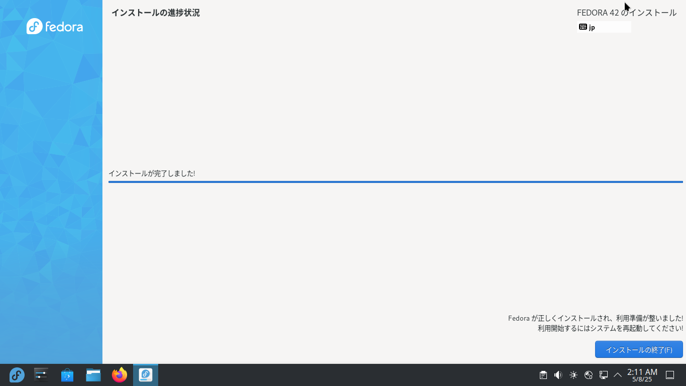 画面や操作が「MATE」と若干異なる部分がありますので、記載しますが、その他は「Fedora - 42 - 共通事項」のインストールの手順をご参照ください。