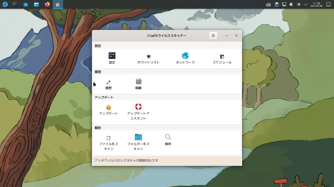 起動直後の状態です。 2025年5月8日の時点で、下記のバージョンでした。 「アンチウィルスのシグネチャが期限切れです」の表示を消す方法や、操作については「デスクトップ環境構築 - 共通事項 - アンチウイルスソフト ClamTk」をご参照ください。 |
