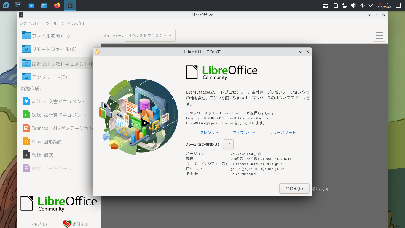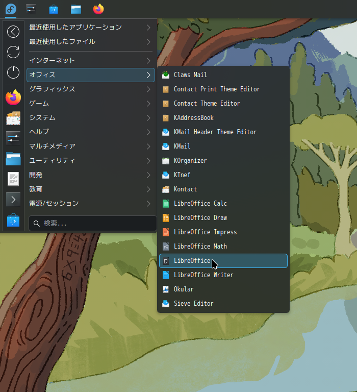 オフィススイートとして、「LIbreOffice」と「KDE」製のものがインストールされていますが、「KDE」のものはよう使いきらんので、「LibreOffice」を使用します。