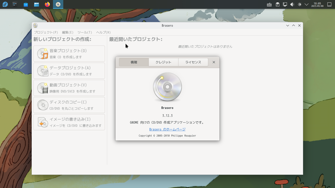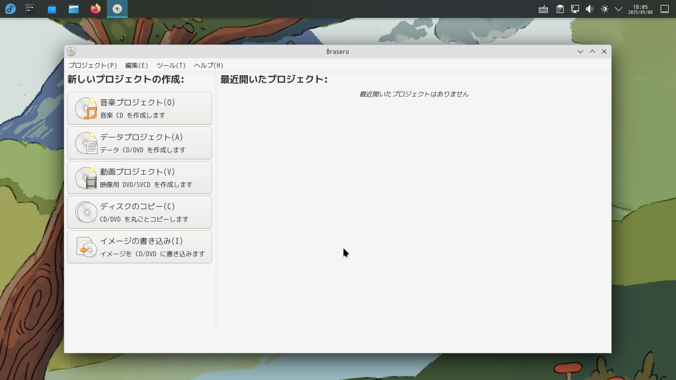 1. 概要 光ディスクライティングソフトとして「Brasero」を使用します。 2. インストール 「dnfdoragora」で「brasero」を検索して、インストールします。 3. 起動 「スタート」→「マルチメディア」→「Brasero」