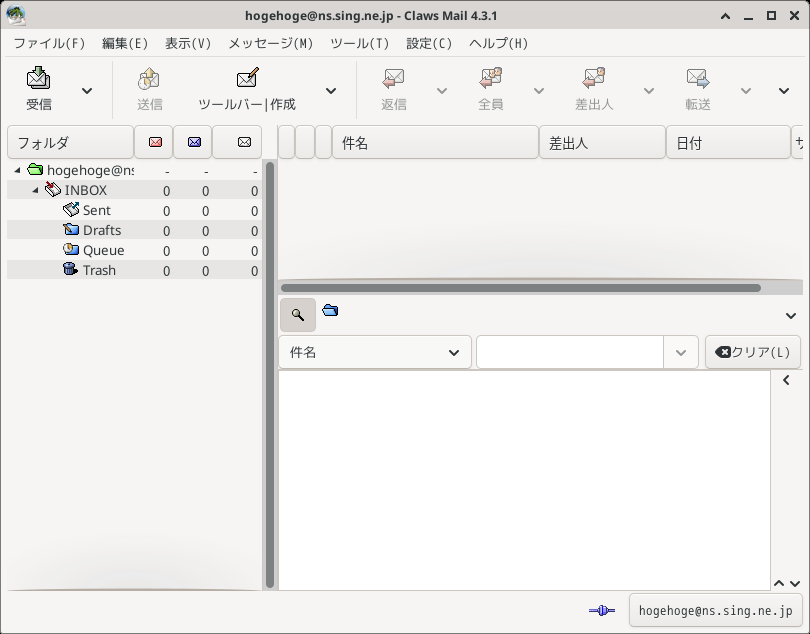 初回起動時は「設定ウィザード」から始まります。 起動直後の状態です。 2025年5月9日の時点で、下記のバージョンでした。 「設定ウィザード」他、操作方法については、「メールクライアント - Claws Mail」をご参照ください。 |