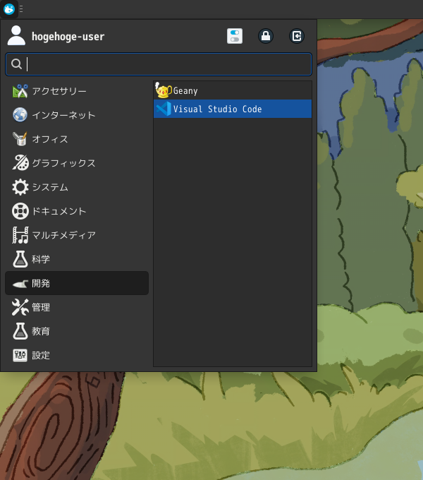 ちょっと変則的なインストールのためか、ログインしなおさないと、メニューへ表示されないデスクトップもありますが、「XFCE」では、そのままメニューへ組み込まれました。