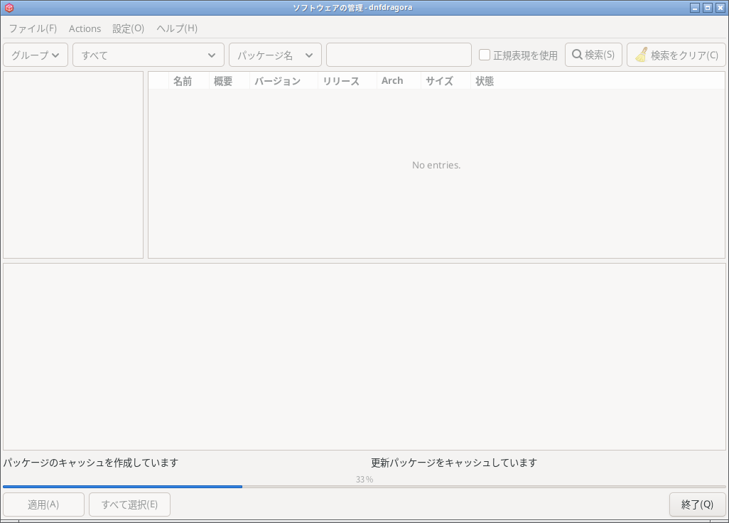 どうも、このバージョンの「Dnfdragora」は、なかなか返ってきません。 この状態で固まります。 「Dnfdragora」を使わずに、「dnf」コマンドでインストールした方が手っ取り早いことが多いのです。 操作等については「Linux - 共通事項 - パッケージ管理フロントエンド」をご参照ください。 |