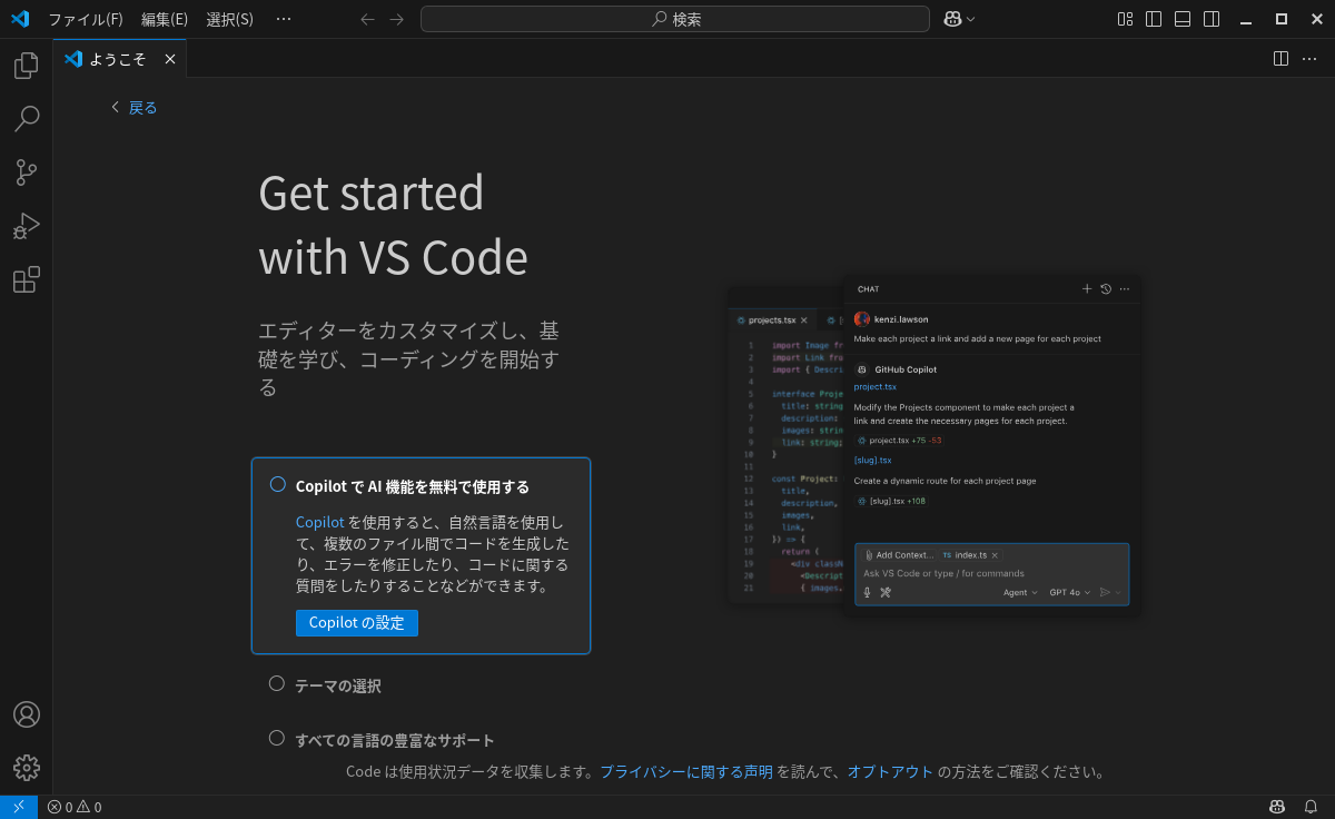 「スタート」→「プログラミング」→「Visual Studio Code」