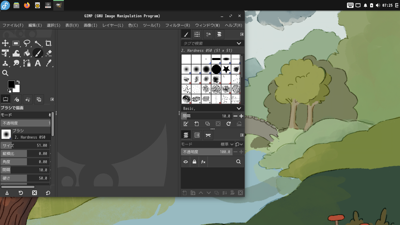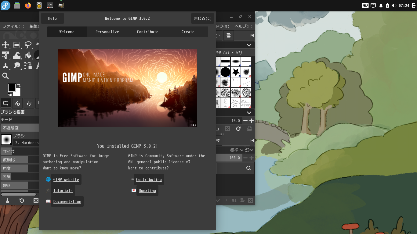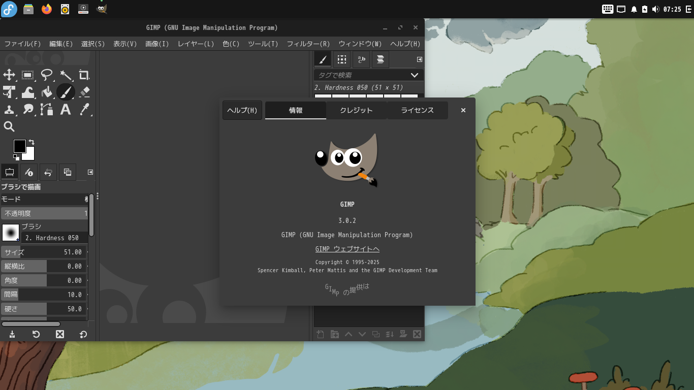「閉じる」 起動直後の状態です。 2025年5月12日の時点で、下記のバージョンでした。 「Arch Linux」「Ubuntu」へ続いて、「Fedora」も「GIMP2」から「GIMP3」へ移行したようです。 操作については、「画像編集ソフト GIMP2」に掲載しています。 上記は簡単なものですので、詳細なものがほしい方は、各所に初歩の手引きから応用編までありますので、そちらを参考にしてください。 |