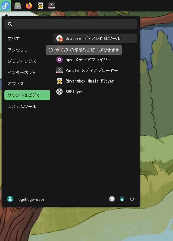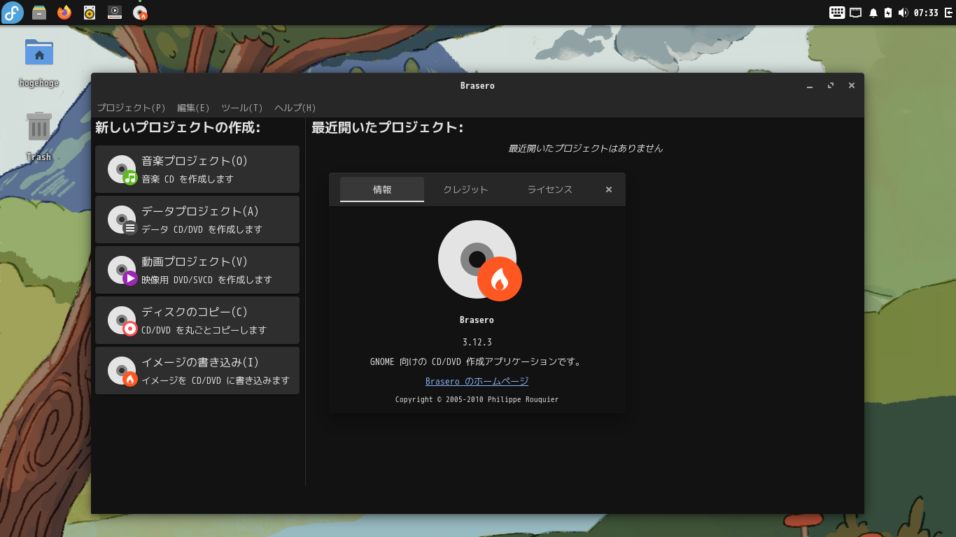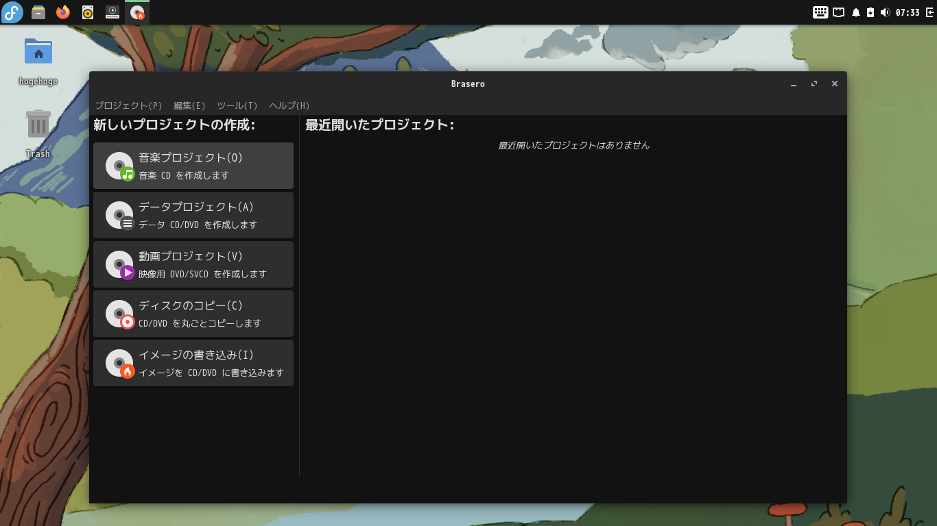 1. 概要 光ディスクライティングソフトとして、「Brasero」を使用します。 2. インストール 「Dnfdragora」で「brasero」を検索して、インストールします。 3. 起動 「スタート」→「サウンドとビデオ」→「Brasero」