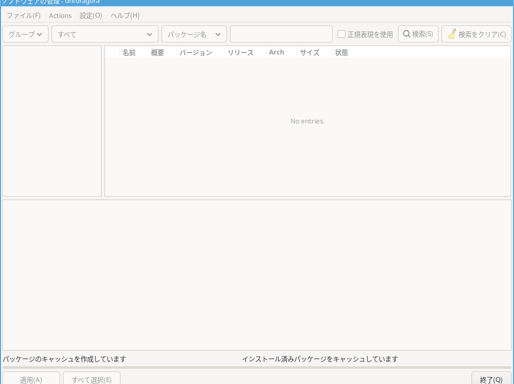 どうも、このバージョンの「Dnfdragora」は、なかなか返ってきません。 この状態で固まります。 「Dnfdragora」を使わずに、「dnf」コマンドでインストールした方が手っ取り早いことが多いのです。 どうせ、画面からはみ出てて、操作しにくいし。 操作等については「Linux - 共通事項 - パッケージ管理フロントエンド」をご参照ください。 |