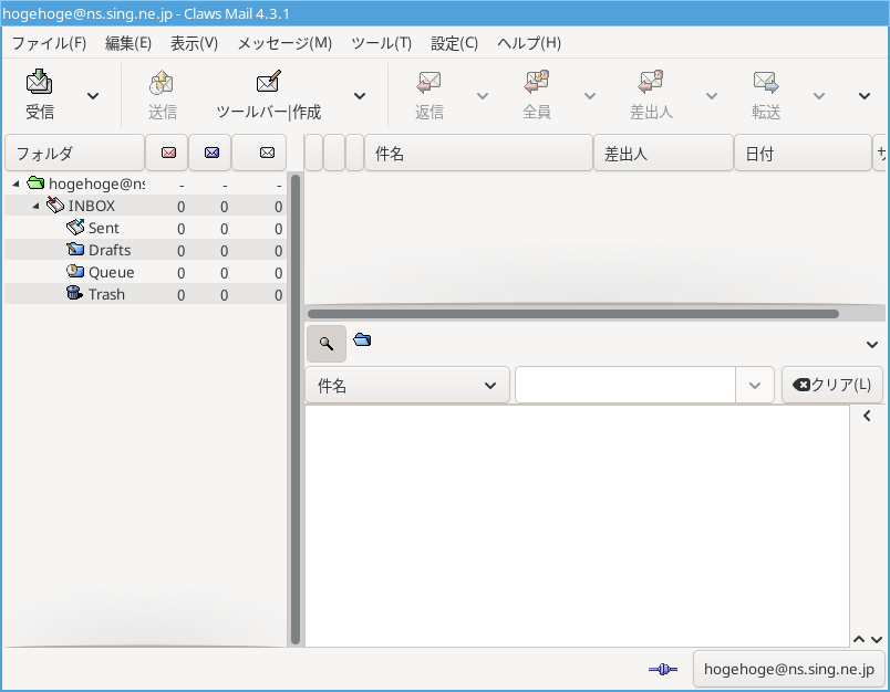初回起動時は「設定ウィザード」から始まります。 起動直後の状態です。 2025年5月14日の時点で、下記のバージョンでした。 「設定ウィザード」他、操作方法については、「メールクライアント - Claws Mail」をご参照ください。 |