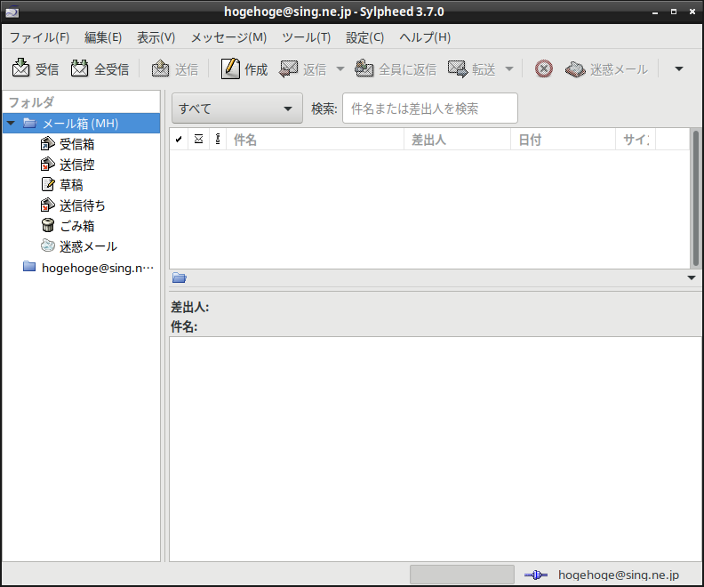 初回起動時は「メールボックスの設定」から始まります。 起動直後の状態です。 2025年5月15日の時点で、下記のバージョンでした。 「設定ウィザード」他、操作方法については、「メールクライアント - Sylpheed」をご参照ください。 |