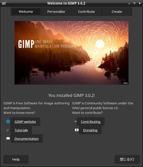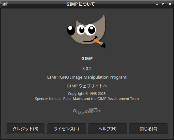 「閉じる」 起動直後の状態です。 2025年5月15日の時点で、下記のバージョンでした。 「Arch Linux」「Ubuntu」へ続いて、「Fedora」も「GIMP2」から「GIMP3」へ移行したようです。 操作については、「画像編集ソフト GIMP2」に掲載しています。 上記は簡単なものですので、詳細なものがほしい方は、各所に初歩の手引きから応用編までありますので、そちらを参考にしてください。 |