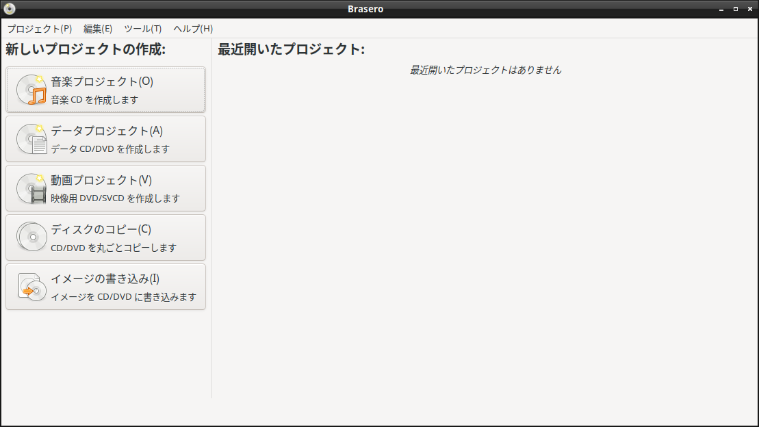 1. 概要 光ディスクライティングソフトとして、「Brasero」を使用します。 「Brasero」は、デフォルトでインストールされています。 2. 起動 「スタート」→「サウンドとビデオ」→「Brasero」