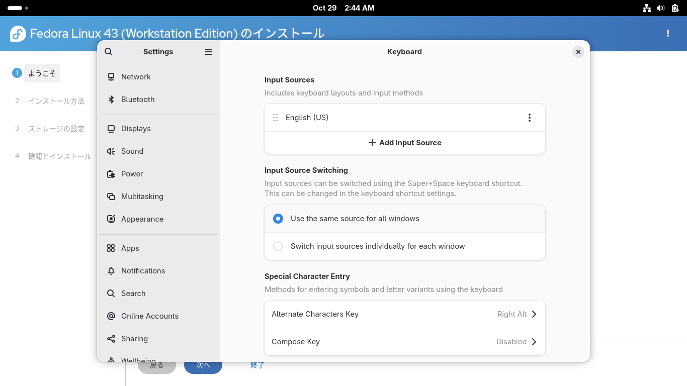 使用するキーボードレイアウトを追加して、「English(US)」を削除。