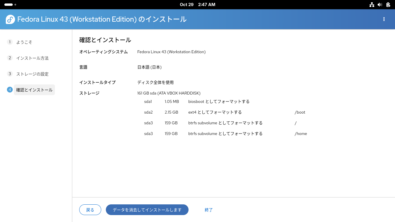 「データを消去してインストールします」