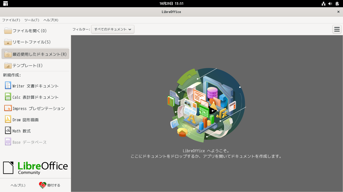 「LibreOffce」は、デフォルトでインストールされていますが、日本語化されていません。