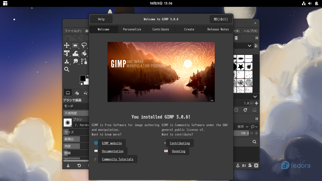 「閉じる」 起動直後の状態です。 2025年10月29日の時点で、下記のバージョンでした。 「Arch Linux」「Ubuntu」へ続いて、「Fedora」も「GIMP2」から「GIMP3」へ移行したようです。 操作については、「画像編集ソフト GIMP」に掲載しています。 上記は簡単なものですので、詳細なものがほしい方は、各所に初歩の手引きから応用編までありますので、そちらを参考にしてください。 |