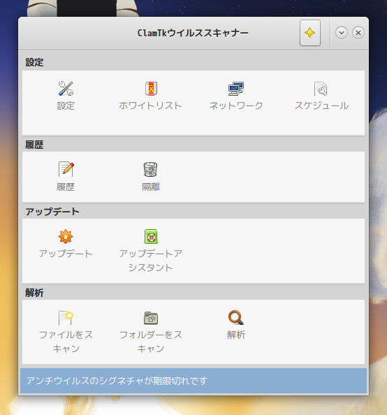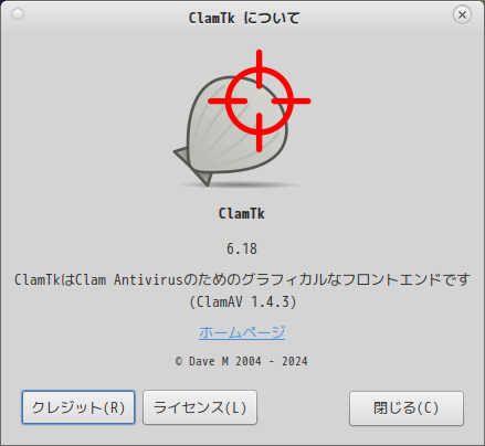 起動直後の状態です。 2025年10月29日の時点で、下記のバージョンでした。 「アンチウィルスのシグネチャが期限切れです」の表示を消す方法や、操作については「デスクトップ環境構築 - 共通事項 - アンチウイルスソフト ClamTk」をご参照ください。 |