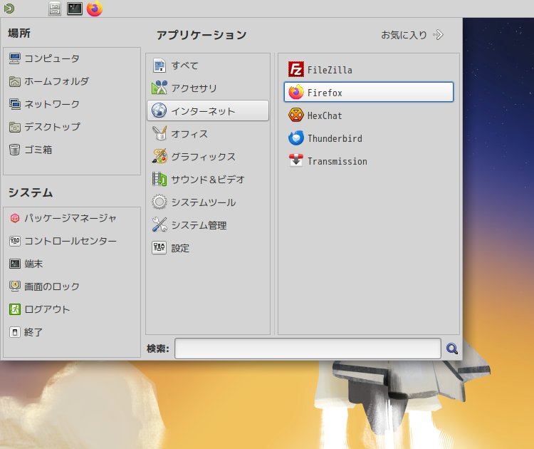 1. 概要 ブラウザとして、「Firefox」がデフォルトでインストールされており、日本語化もされていますので、そのまま使います。 2. 起動 「スタート」→「インターネット」→「Firefox」