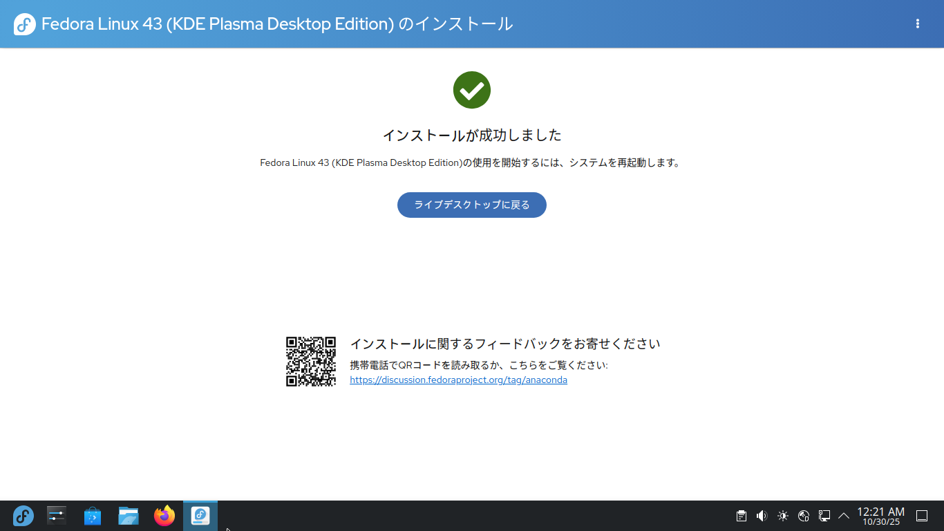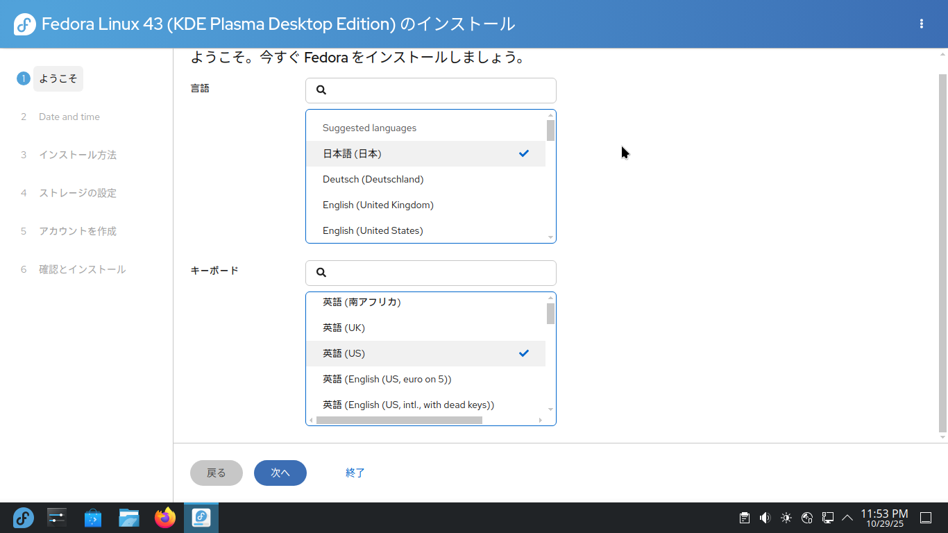 画面や操作が「MATE」と若干異なる部分がありますので、記載しますが、その他は「Fedora - 43 - 共通事項」のインストールの手順をご参照ください。