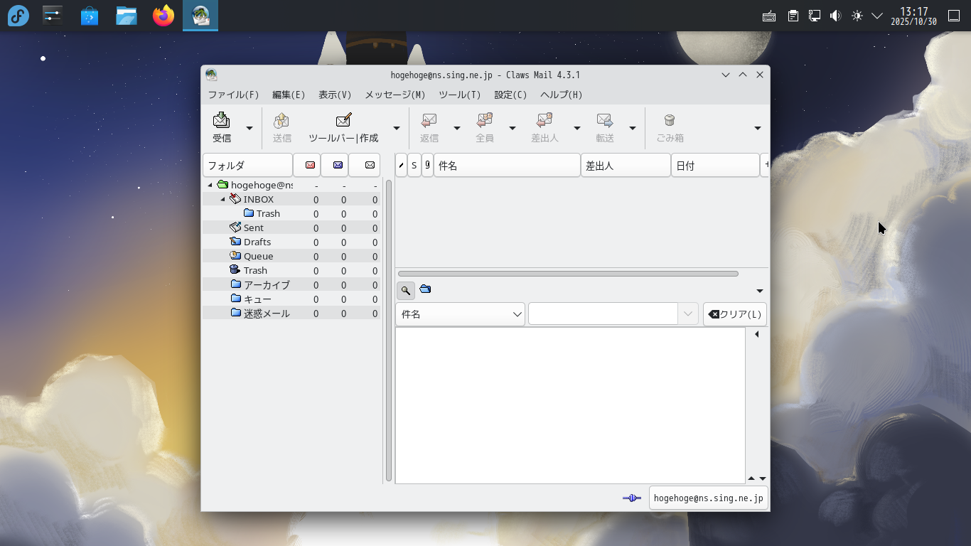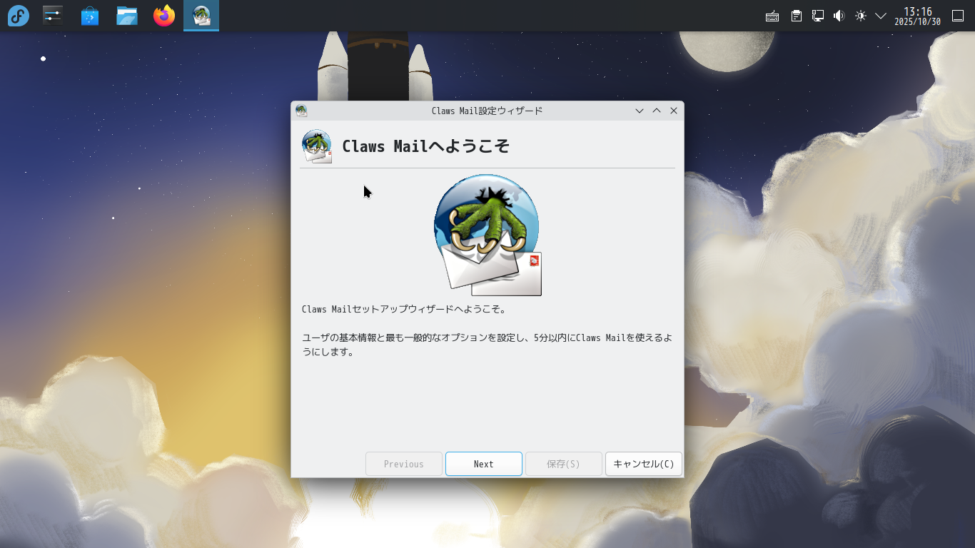 初回起動時は「設定ウィザード」から始まります。 起動直後の状態です。 2025年10月30日の時点で、下記のバージョンでした。 「設定ウィザード」他、操作方法については、「メールクライアント - Claws Mail」をご参照ください。 |
