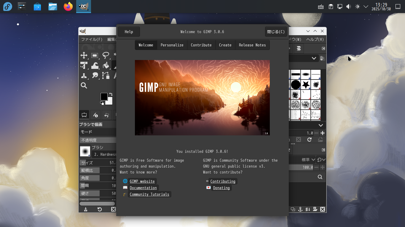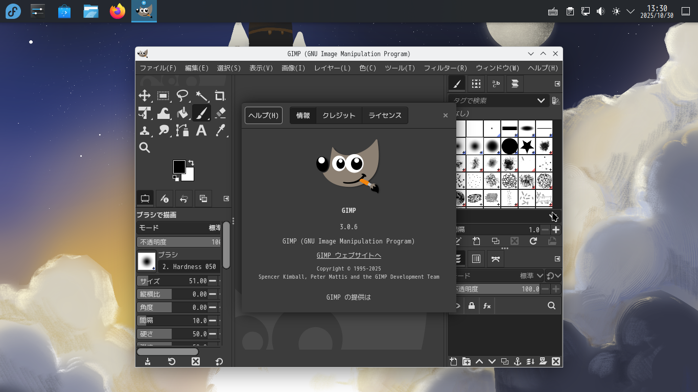 「閉じる」 起動直後の状態です。 2025年10月30日の時点で、下記のバージョンでした。 操作については、「画像編集ソフト GIMP2」に掲載しています。 上記は簡単なものですので、詳細なものがほしい方は、各所に初歩の手引きから応用編までありますので、そちらを参考にしてください。 |