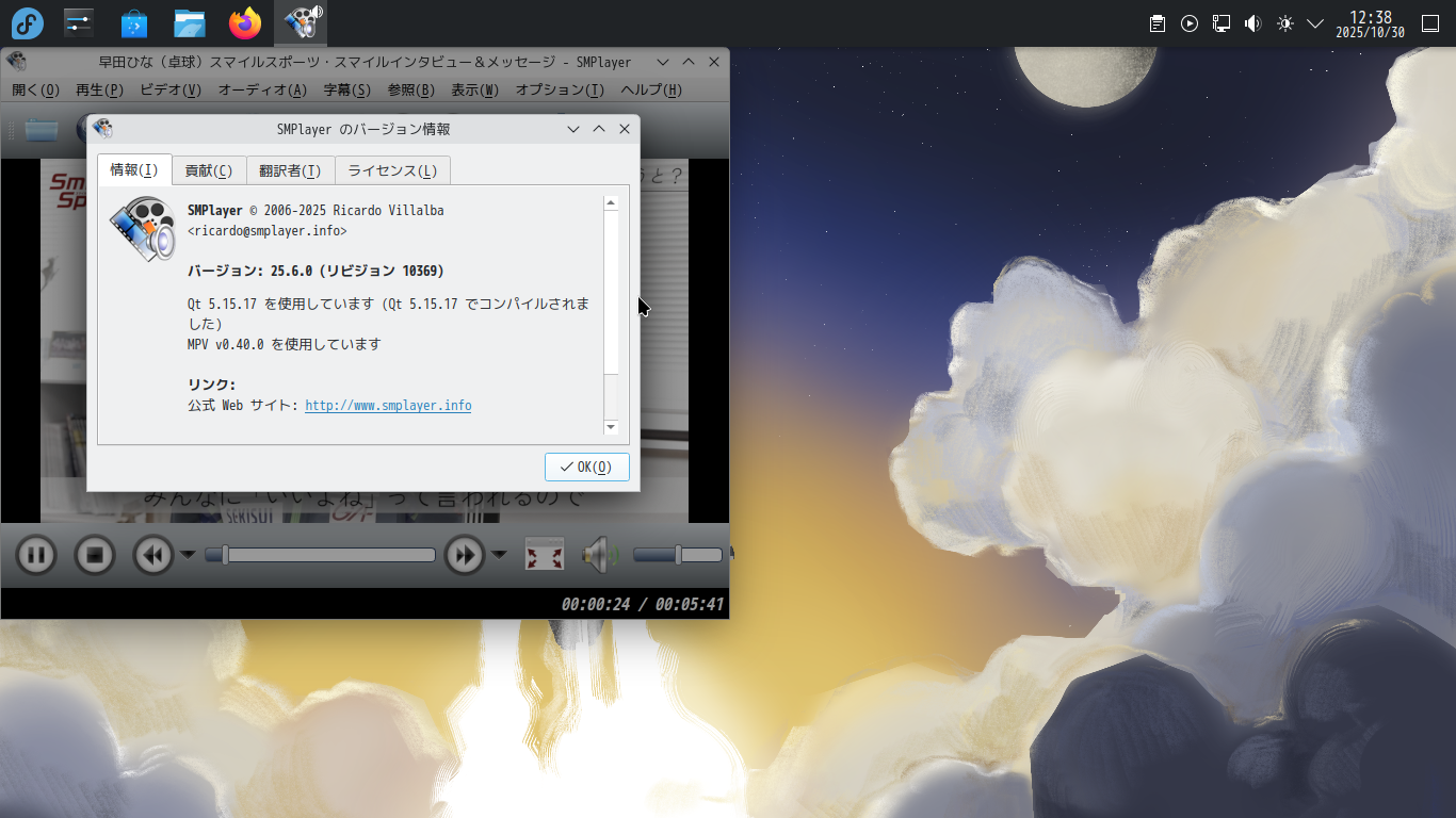 1. 概要 メディアプレイヤーとして、「Parole」というプレイヤーがインストールされていますが、使い慣れている「SMPlayer」ををインストールして使います。 2. インストール 「SMPlayer」のインストールには、「unitedrpms」というリポジトリを追加する必要があります。 リポジトリ追加の手順に関しては、「Fedora - 43 - 共通事項」をご参照ください。 リポジトリを追加したら、「root」ユーザ権限で。 dnf install -y smplayer openh264 3. 起動 「スタート」→「マルチメディア」→「SMPlayer」