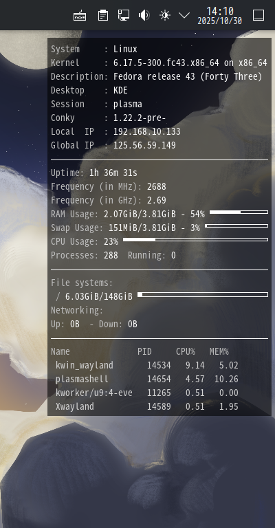 再ログイン後に、デスクトップ右に、「Conky」の表示が現れます。