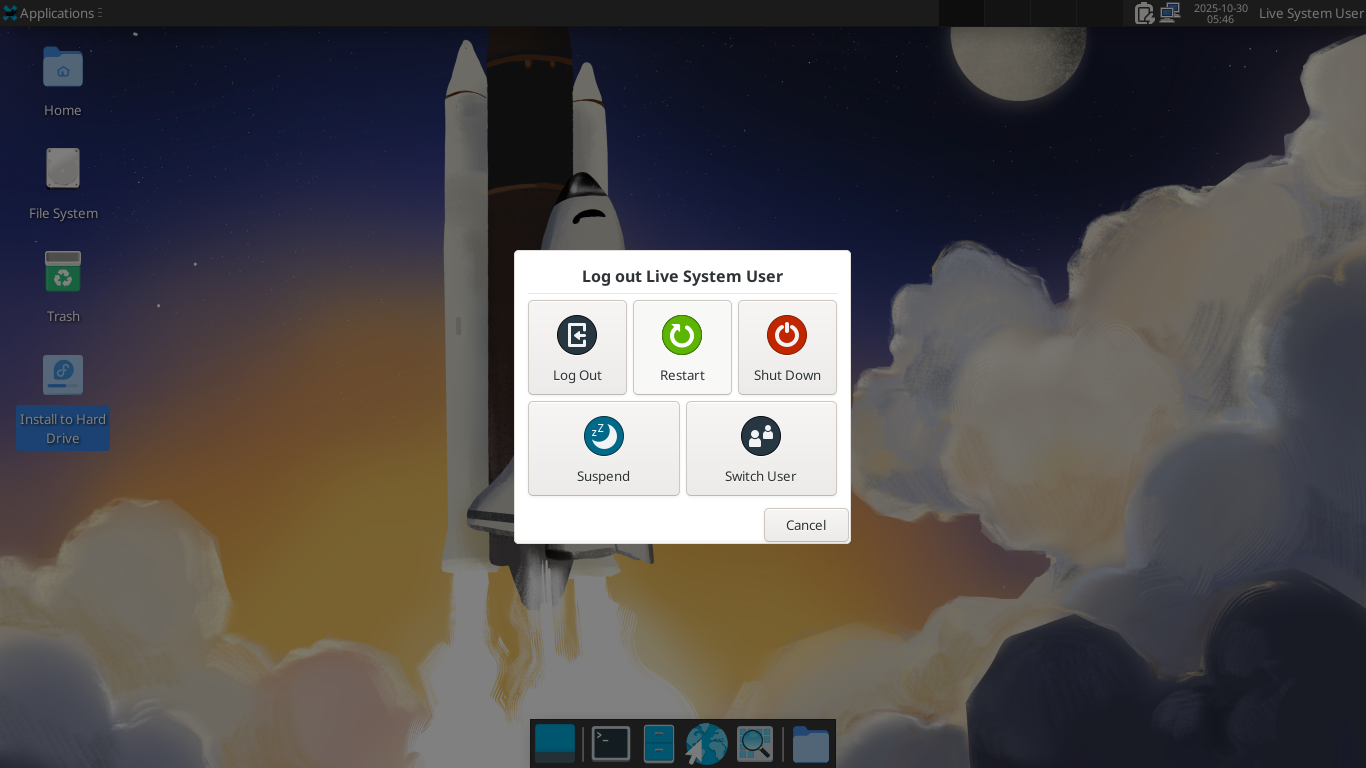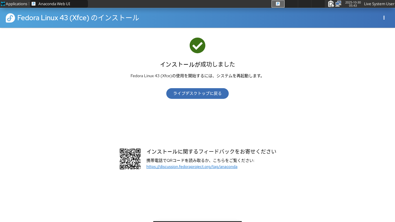 以降の手順は「Fedora - 43 - 共通事項」と同様となりますので、そちらをご参照ください。 インストールが、完了したら。 「ライブデスクトップに戻る」 デスクトップに戻って。 「スタート」→「Logout」 「Restart」