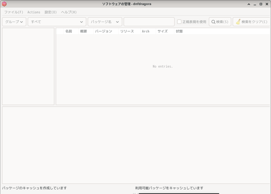 相変わらず、「Dnfdragora」は、なかなか返ってきません。 この状態で固まります。 「Dnfdragora」を使わずに、「dnf」コマンドでインストールした方が手っ取り早いことが多いのです。 操作等については「Linux - 共通事項 - パッケージ管理フロントエンド」をご参照ください。 |