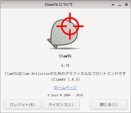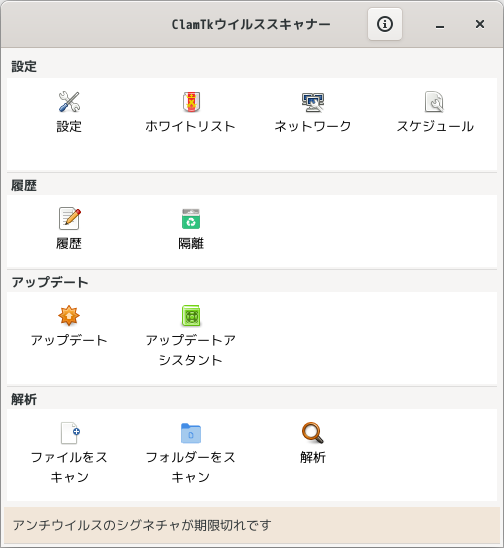 起動直後の状態です。 2025年10月30日の時点で、下記のバージョンでした。 「アンチウィルスのシグネチャが期限切れです」の表示を消す方法や、操作については「デスクトップ環境構築 - 共通事項 - アンチウイルスソフト ClamTk」をご参照ください。 |