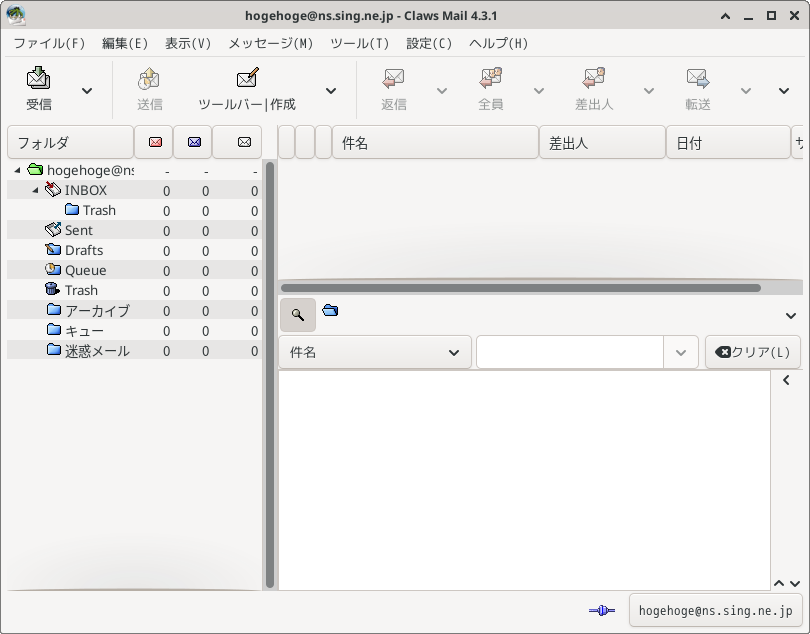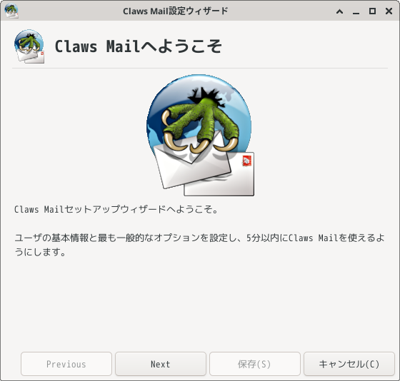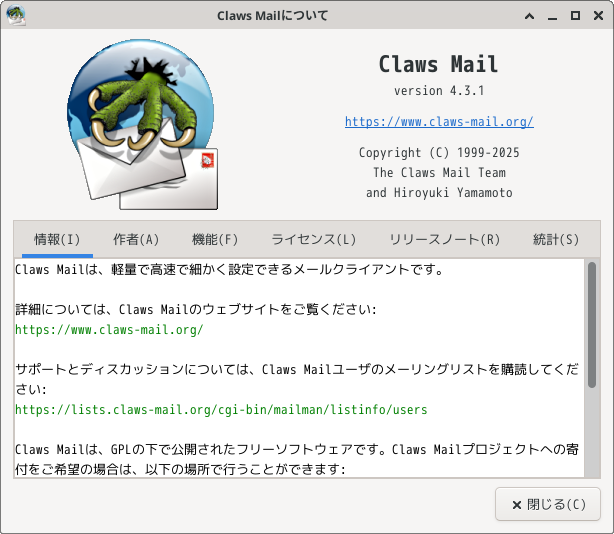 初回起動時は「設定ウィザード」から始まります。 起動直後の状態です。 2025年10月30日の時点で、下記のバージョンでした。 「設定ウィザード」他、操作方法については、「メールクライアント - Claws Mail」をご参照ください。 |