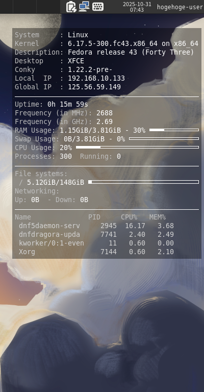 再ログイン後に、デスクトップ右に、「Conky」の表示が現れます。